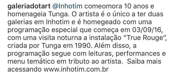 São 2,5 milhões de visitantes desde a inauguração de INHOTIM há 10 anos atrás, sendo 360 mil só no ano passado. Os estrangeiros são 25% do total. São necessários 3 dias para conhecer todas as atrações. Por esse motivo, planeja-se para 2017 a abertura de um hotel bem ao lado, com 44 bangalôs de luxo. Por enquanto, só há 2 hospedagens disponíveis a 4 km do museu: ESTRADA REAL PALACE HOTEL e VILLE DE MONTAGNE , ambos 3* e ambos em Brumadinho.   Até dia 11 , estará em cartaz a programação comemorativa dos 10 anos.