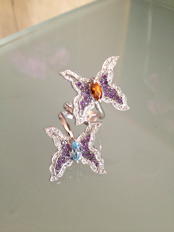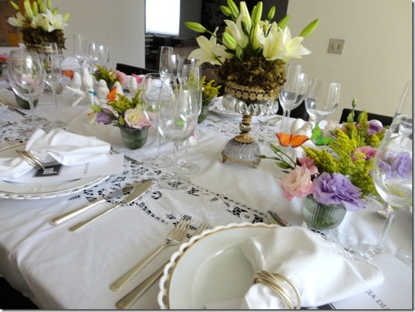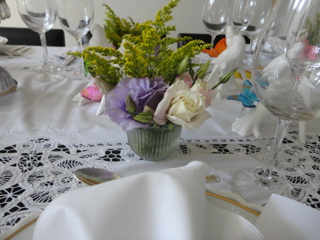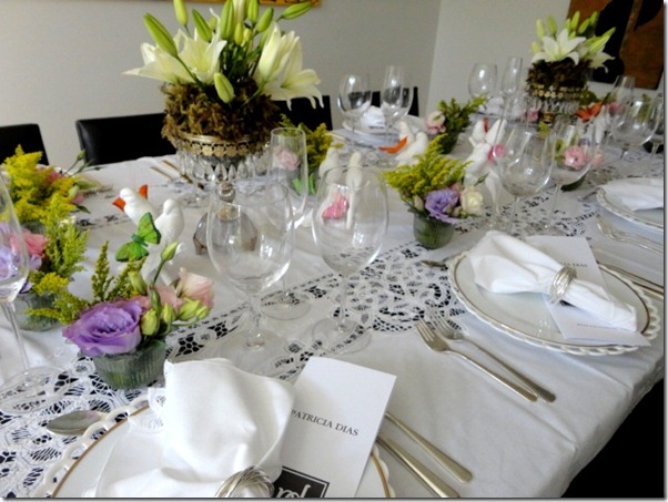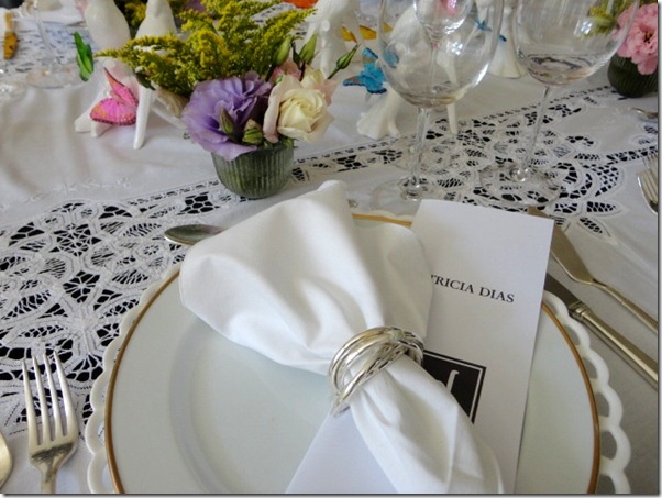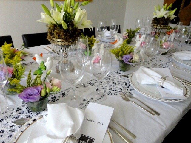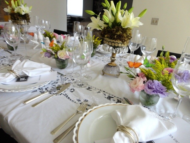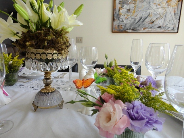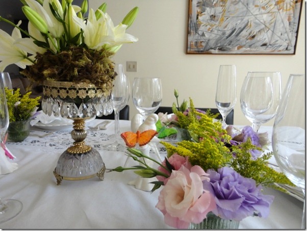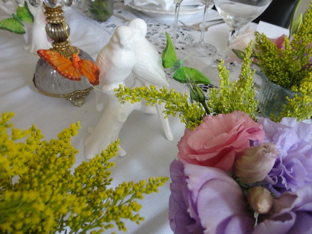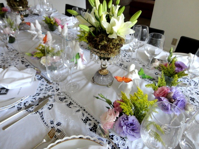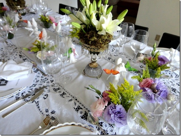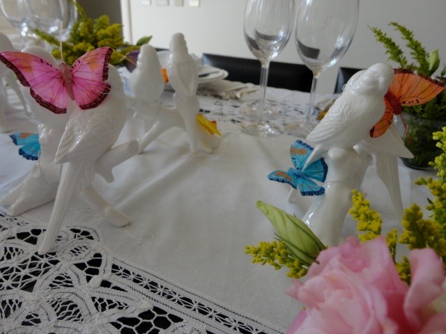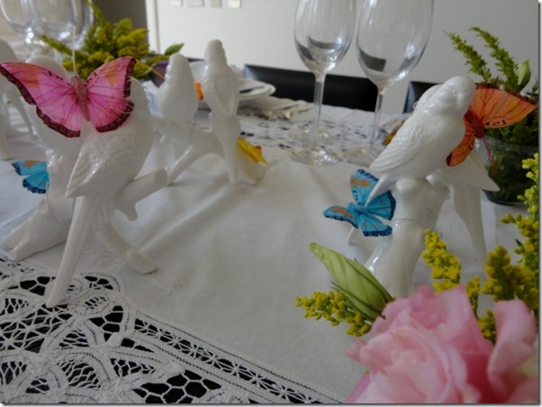 Borboletas e pássaros também no centro da mesa, entre os lírios nos cristais .