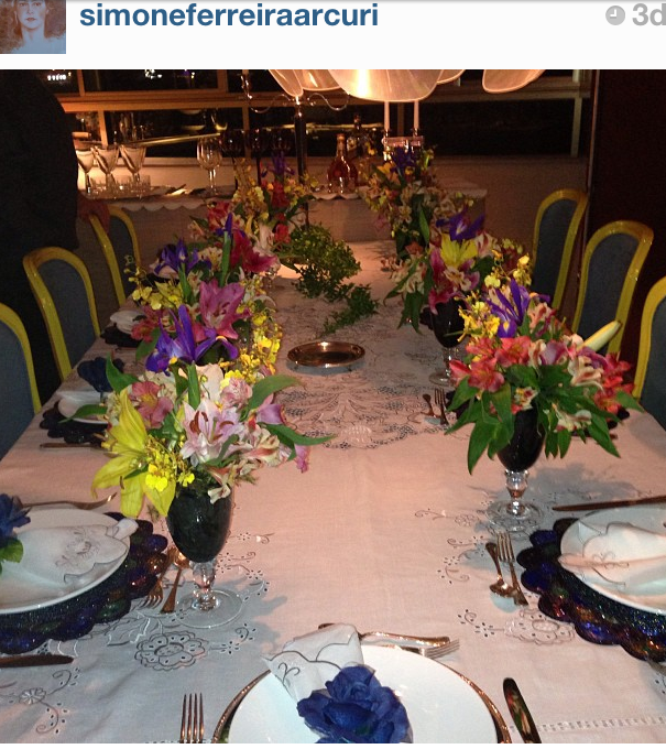 Na 1a. foto, amei os tons suaves das flores, os cristais e as louças brancas . Na 2a, adorei os mini-vasos individuais de flores em vez de flores no centro. Essa foto, “ roubei “ do insta da Simone Arcuri, se não me engano, em jantar chez Myrna Gondim. ![]()