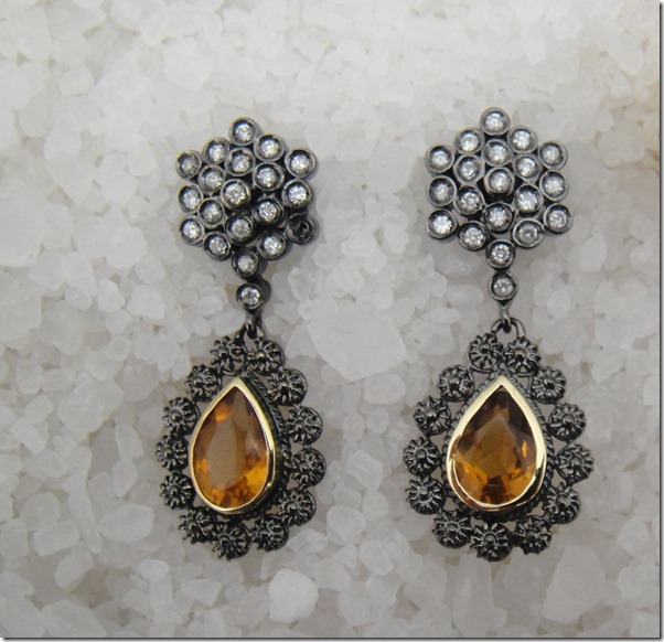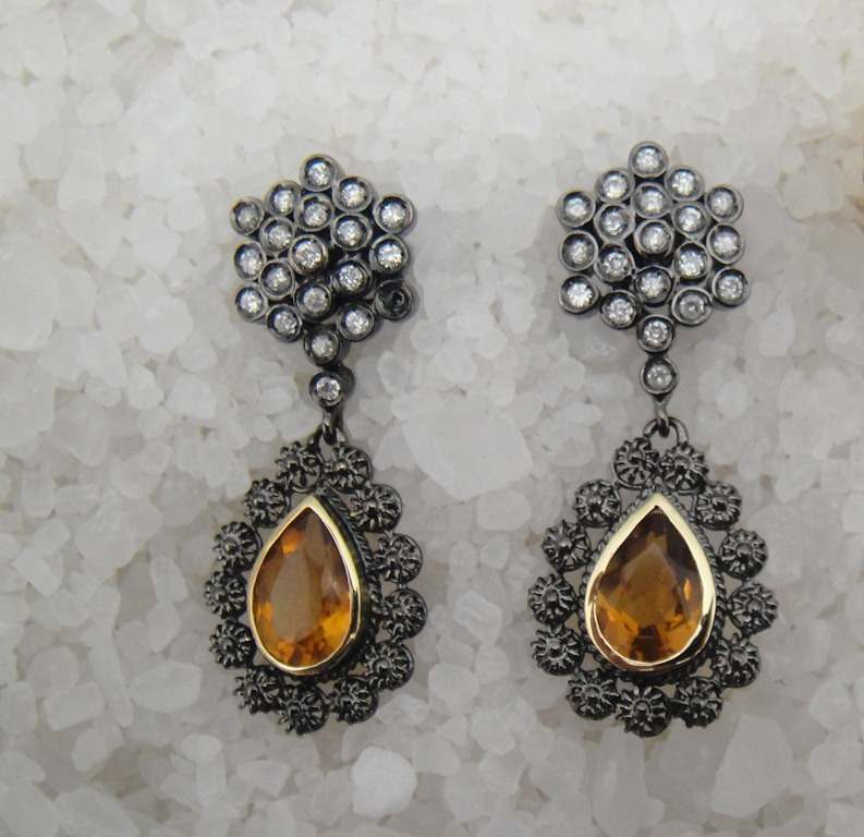 E o brinco tem um design antiguinho que combina super bem com todos os tons de ouro, pois ele tem os brilhantes e a fliligrana no ouro negro, e a pedra citrine cravada em caixa de ouro amarelo. Uma peça super versátil ! ( brinco : 10x 650,00 = 6500,00 )