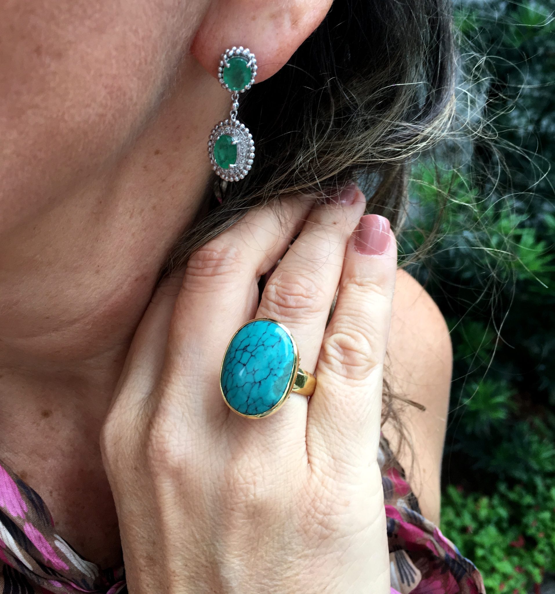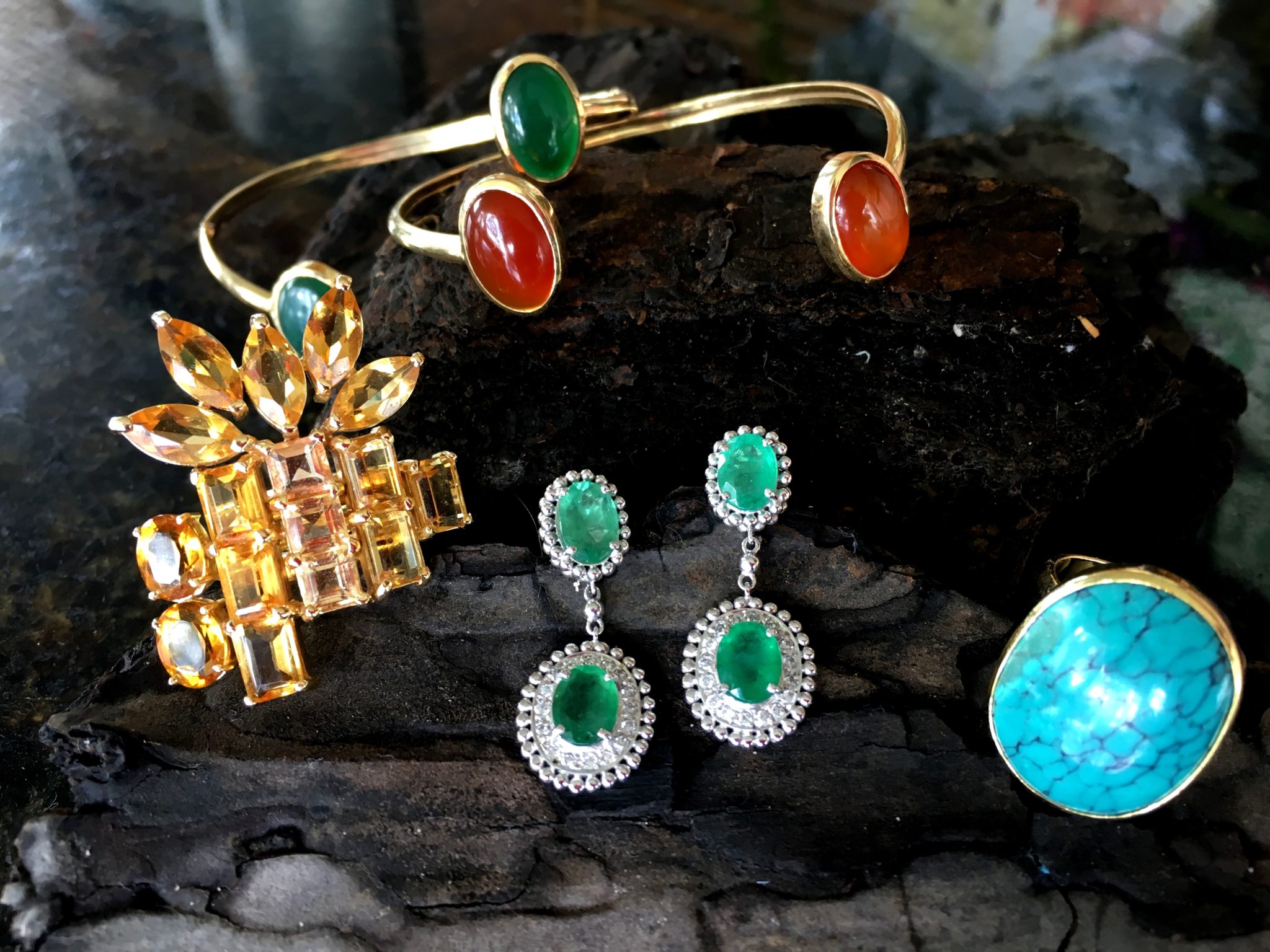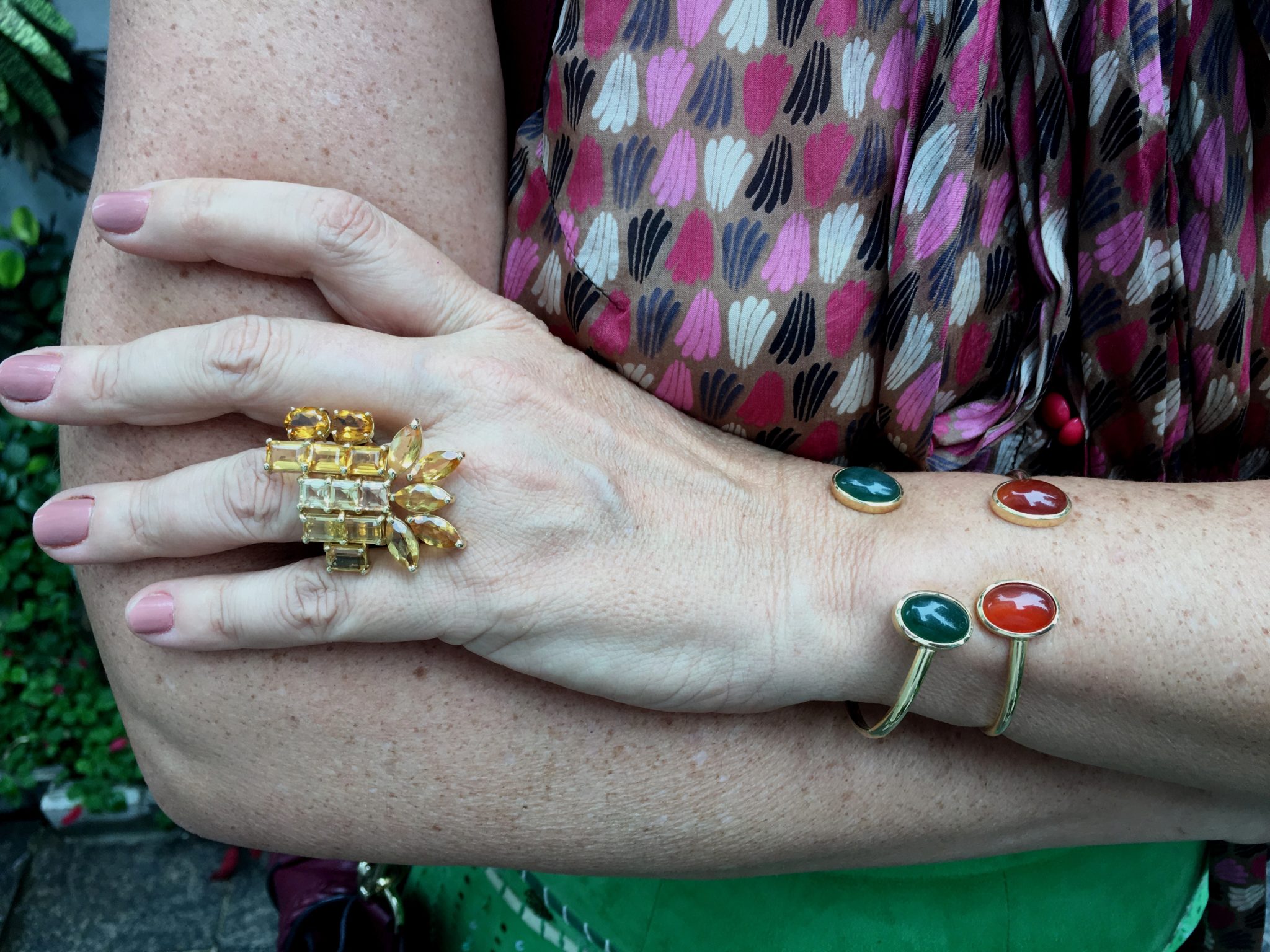 Acessórios na mesma cor, porque as jóias explodiram em todas as cores. Como se eu também estivesse saindo da “fornada” …. rsrs Foi de propósito que misturei tudo: brinco de esmeralda, anel de turquesa, anel de citrine, braceletes em ágatas.