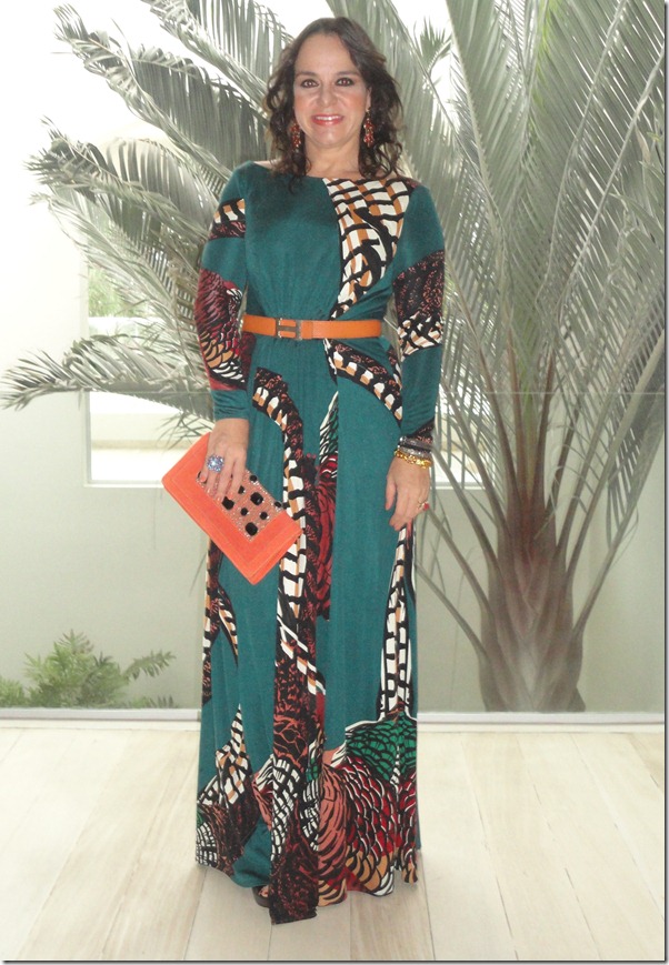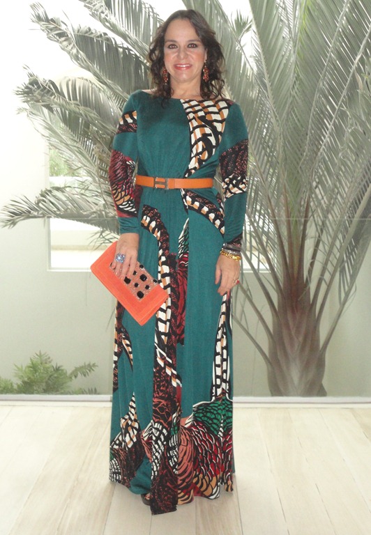 Complementos em laranja (cinto e bolsa),harmonizaram com brinco e anel.