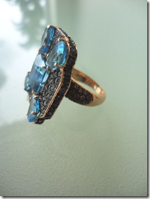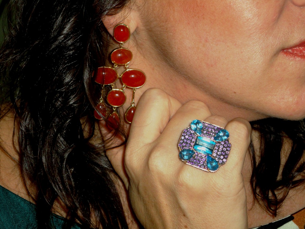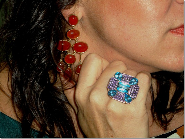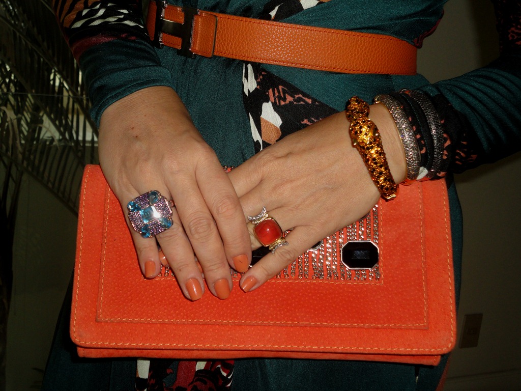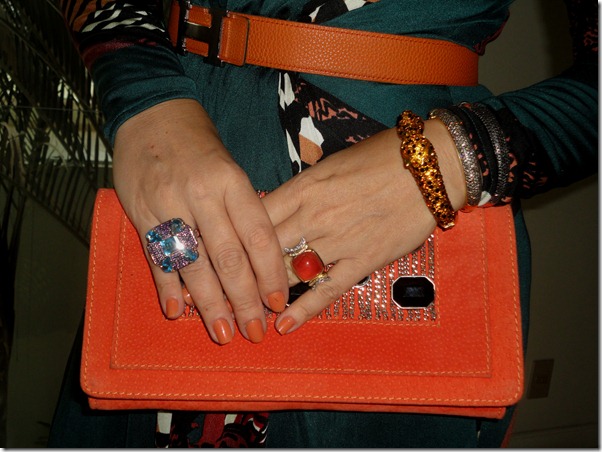 Para o coquetel,eu pensei em jóias que traduzissem meu trabalho contemporâneo, ao misturar cores (O LARANJA-A COR ELEITA PARA 2012!) ,com brilhantes (brown e negros-outra super tendência!) e com um anel super-poderoso,tanto em forma,quanto em cor!Ele,a princípio,não “combinava” com a minha roupa,mas foi exatamente isso que me fez escolher essa peça-para dar a ela um destaque – e por ele ser em ouro rosa com ródio negro (outra tendência!),pois ao mesmo tempo que não combina com nada,ele combina com tudo!!!! rsrsrs