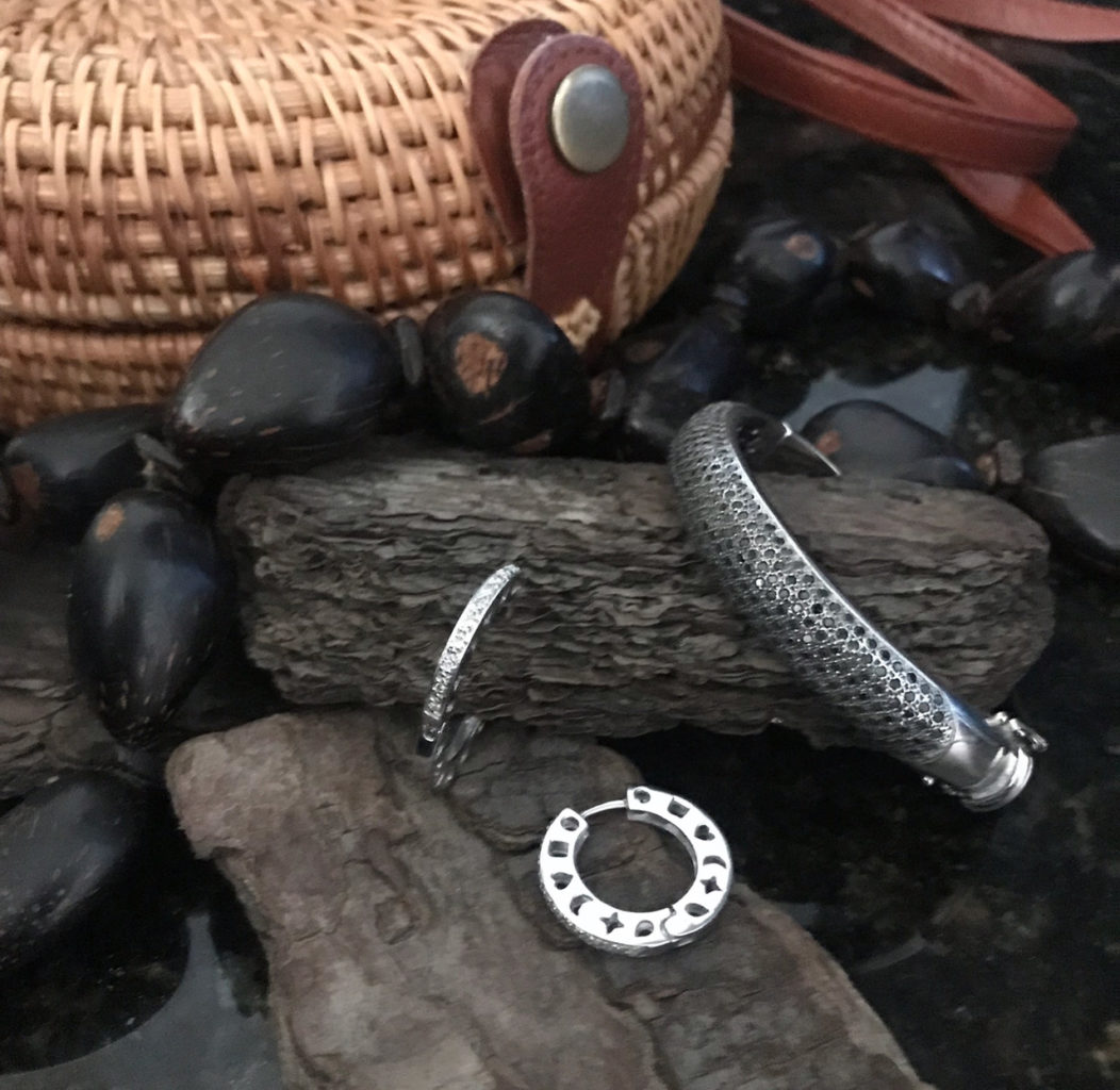 Quando misturamos materiais naturais com brilhantes conforme você vê acima, vamos do rústico ao chique em segundos. Uma pequena argola em brilhantes assim como um bracelete de brilhantes negros refinaram a produção.