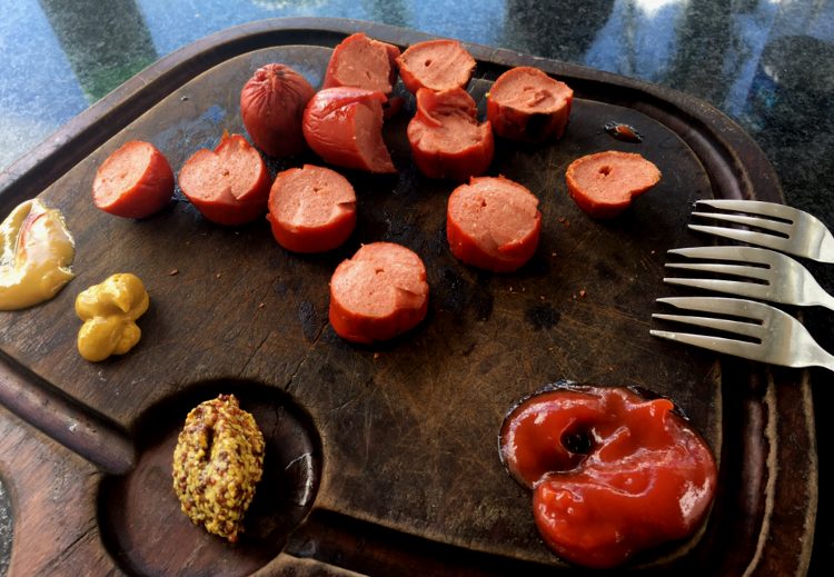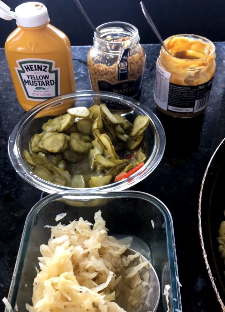 De entrada, servi salsichão assado na churrasqueira com ketchup e 3 tipos diferentes de mostarda. Como prato principal, costelinha de porco assada no forno, pepino e chucrute em conserva ( ambos HEMMER ), uma massa estilo SPATZEL e Salada de Batata ( receita abaixo) .