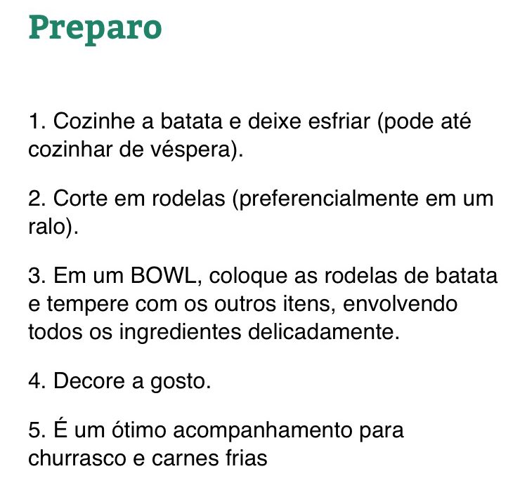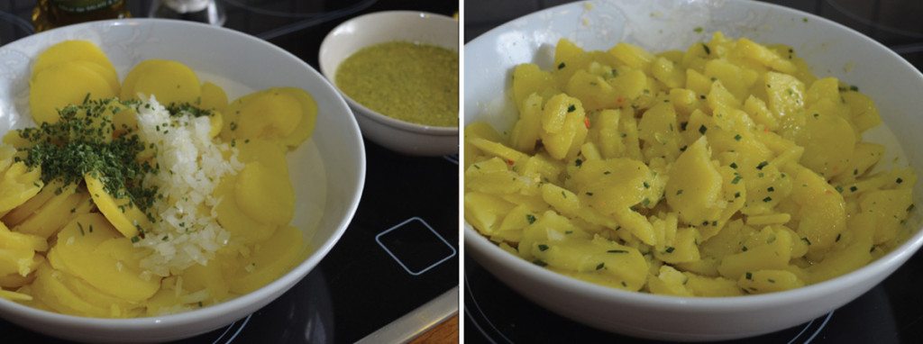 A salada de batatas ficou ótima. Ela é tradicionalmente feita SEM MAIONESE e eu obedeci à risca. Pode fazer! Ficou igualzinha às de lá. ( Dica: usar batata asterix – aquela da casca rosada )