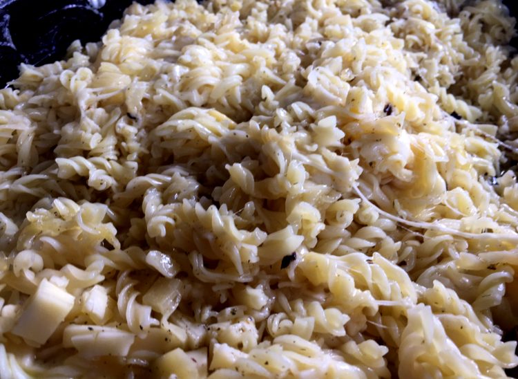 A massa SPATZEL é tradicionalmente feita em casa com farinha e ovos, mas optei por comprar massa pronta. Cozinhei um mini-fusili com ovos, passei na manteiga derretida e adicionei mussarela ralada em grande quantidade .