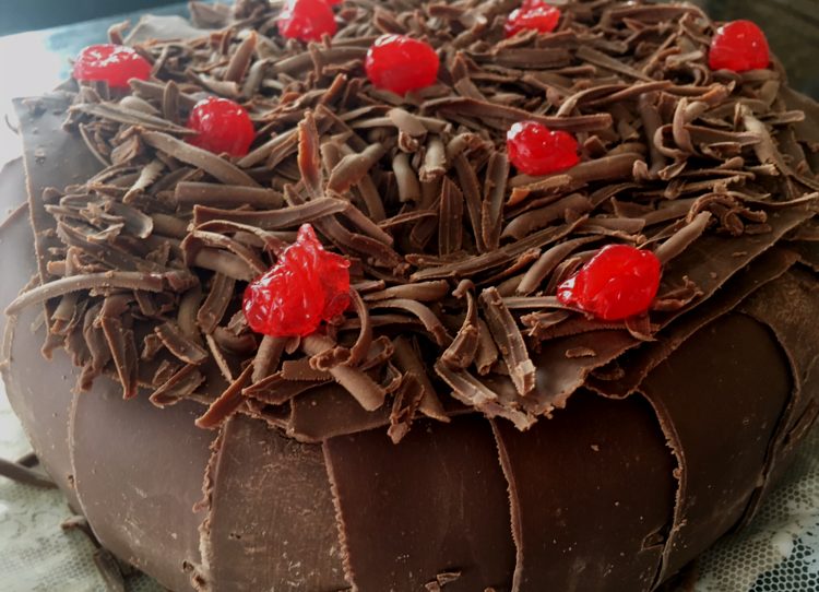 Esse é o famoso bolo Floresta Negra. Alternando camadas de bolo de chocolate, cerejas e chantilly são rematados com mais creme, cerejas e raspas de chocolate.