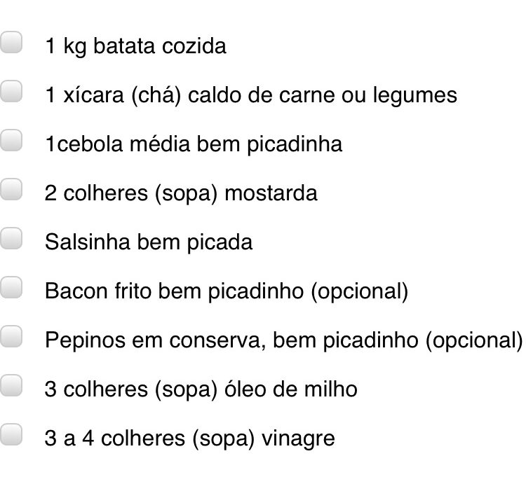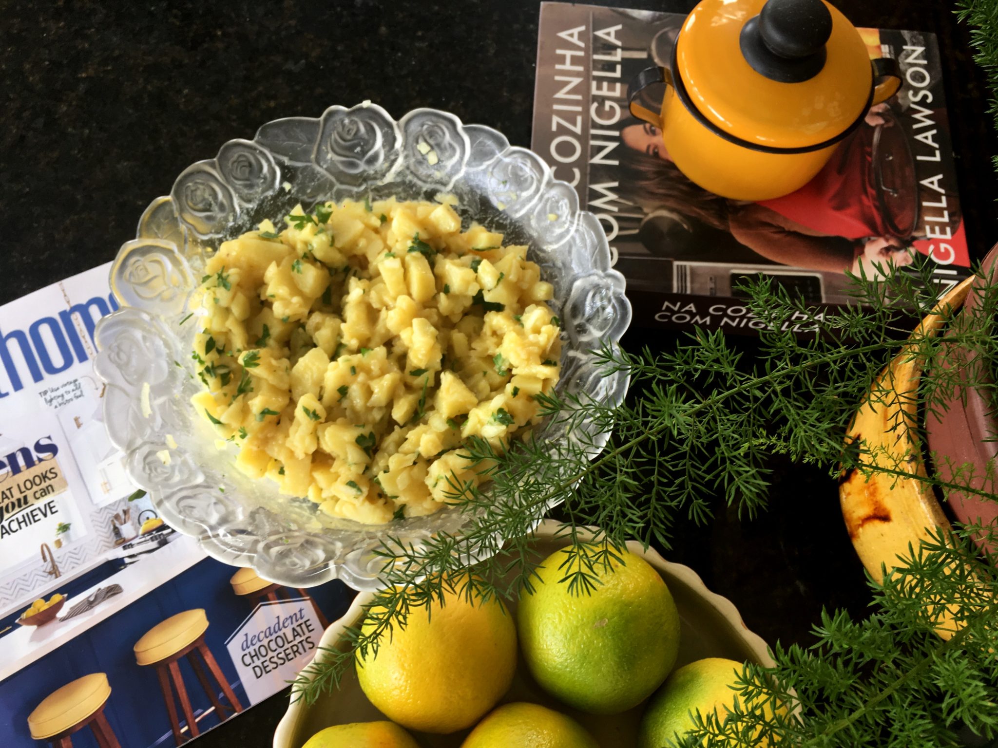 A salada de batatas ficou ótima. Ela é tradicionalmente feita SEM MAIONESE e eu obedeci à risca. Pode fazer! Ficou igualzinha às de lá. ( Dica: usar batata asterix – aquela da casca rosada )