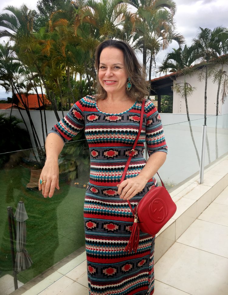 A moda étnica tem gosto de férias, pois ela carrega consigo elementos mágicos que nos remetem diretamente a alguma civilização. Seja por um detalhe típico, uma estampa característica, ou um shape particular, essa moda nos torna diferenciados em meio à multidão. Se sua roupa ou acessório ainda tiver a procedência de algum lugar que você tenha estado, aí sim, você arrasou muito! Vale então tirar aquele vestidinho do armário, aquele xale, aquele lenço que você comprou e nunca usou… porque no fim de ano tá todo mundo em clima de férias e festas e dá uma vontade danada da sair assim. E vamos combinar? Essas roupas costumam ser lindas e coloridas! Às vezes nos falta apenas uma “coragenzinha extra” de sair fora da caixa. Esse meu vestido.. eu amo! Trouxe de Londres, do mercado OLD SPITAFIELDS . Aliás, pessoas, eu adoro um mercado de pulgas. Nem sempre compro, mas gosto de ir, ver, pois vendo, aprendo! Nesses lugares, até a comida costuma ser mais autêntica e menos turística, como também são as pessoas e o que se vende lá. Pensa bem: eu usei esse vestido com essa estampa … em Londres!! rsrs … Chocou? Pois eu amei! Para passear em um outono em Londres, achei que seria interessante usar com botas e blazer … Gostaram? Cá estou eu vestindo ele de novo nesse dezembro com frio de julho, porém com flatforms LUIZA BARCELLOS e bag GUCCI. A estampa em formatos geométricos nos remete às tribos NAVAJO dos índios norte-americanos. Mas … se voce não souber nada desse assunto … vamos combinar? Bonito é! E enfeita ” baldes ” … rsrs .. como diz meu querido Alcides. Se colocar com turquesas, melhor ainda! Sinta-se étnica e globalizada ! E … saia por aí … feliz da vida!