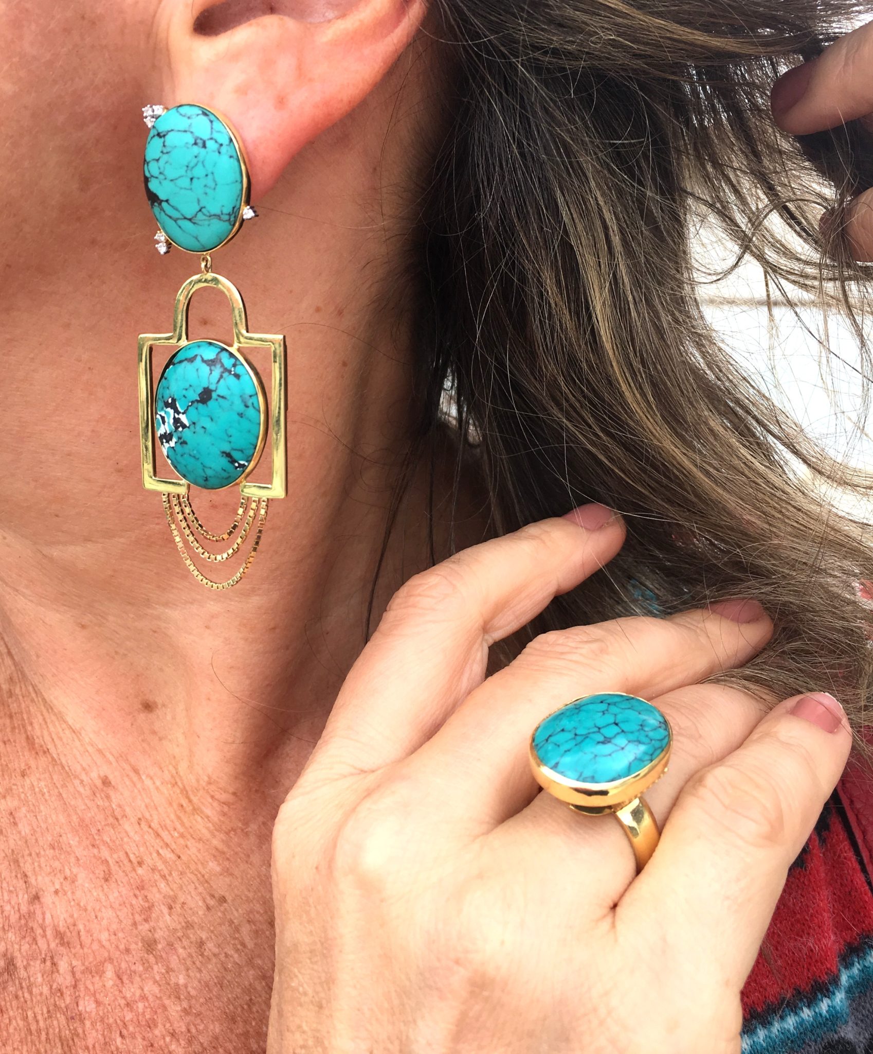 Ah! Pesquisando mais um pouquinho sobra as tribos NAVAJO, o que eu descubro? Eles usavam e abusavam das turquesas e é nessa região que ainda se encontra a maior extração e produção no mundo. Foi exatamente ESSA a pedra que escolhi para esse look. Doido isso, né? Eu acredito demais no ZEITGEIST – esse inconsciente coletivo que faz as pessoas quererem se mover em torno das mesmas idéias – E vamos combinar? Turquesas são jóias tão lindas, que acho que toda mulher deveria ter. No verão então, é uma maravilha! Levanta um vestido branco, vai bem com coloridos … e tem esse ar escapista de férias … Por que? Porque foi descoberta na Ásia e de lá sairam as 1as. jóias. Isso nos remete a algo étnico imediatamente, não é? Em mim, ainda lembra o mar – então, toda vez que vou para a praia, quero levar turquesas. Caribe, Nordeste, Grécia … me fala se não é o máximo usar! Essas peças são exclusivas JÓIAS PD, ambas únicas.