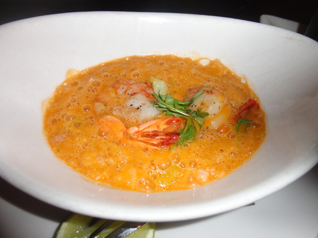 caldo de camarão com flocos crocantes de arros e bisque de lagosta