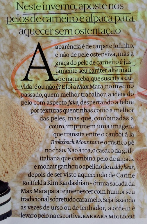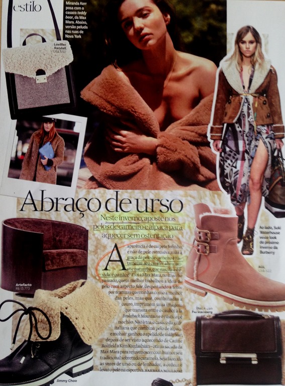 Esse é de pele fake ARMANI EXCHANGE e tem tudo a ver com essa cara de carpete fofinho que a VOGUE JUNHO mostrou em destaque. Misturado a renda e calça verde miltar, fica uma coisa moderninha e romantica ao mesmo tempo.