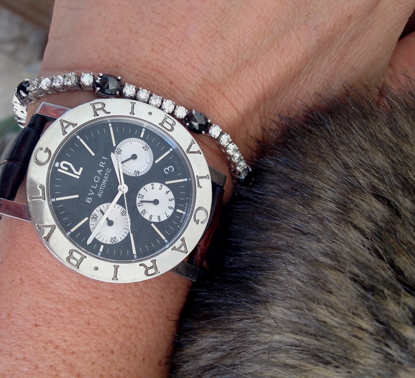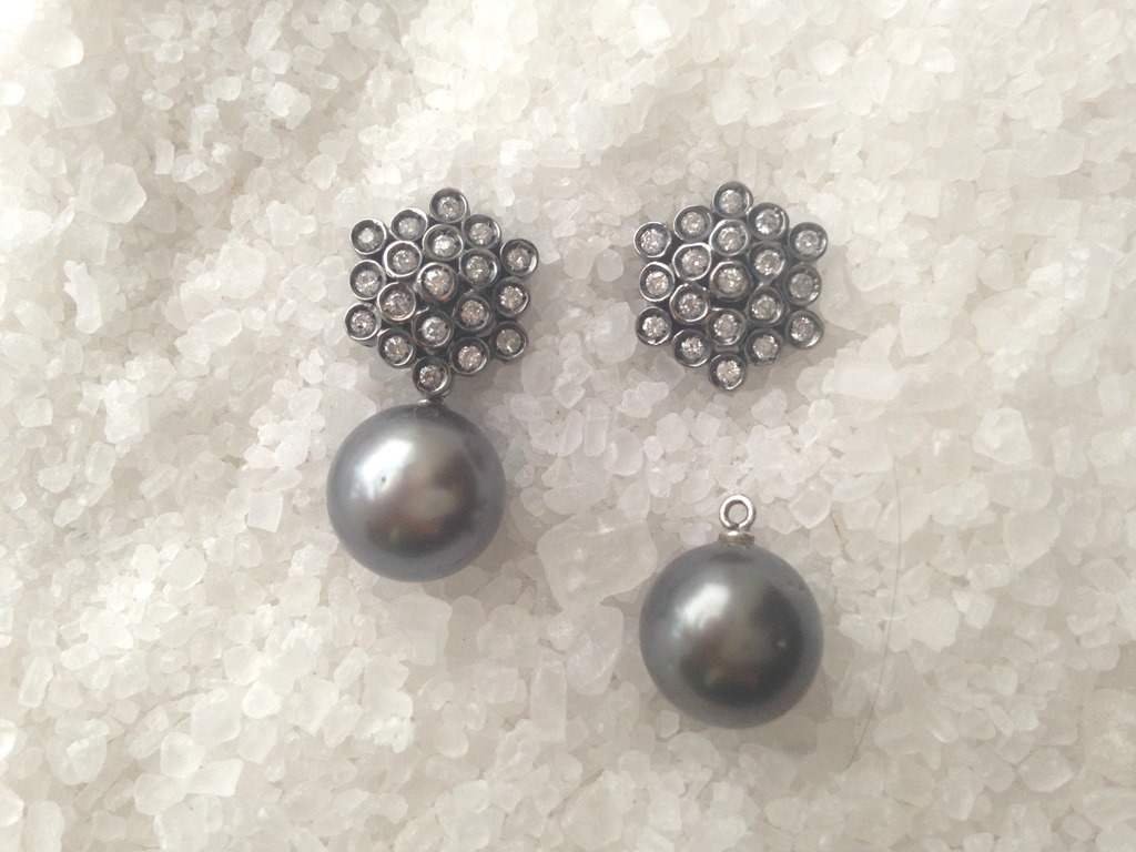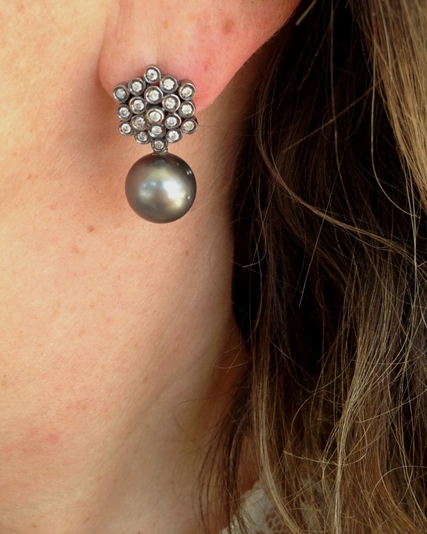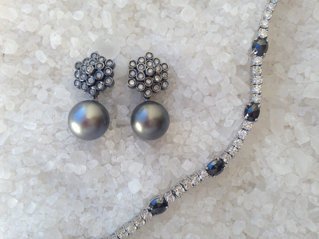 De jóias, para completar o look, pensei em clássicos : uma riviera de brilhantes negros e brancos, e um brinco de brilhantes e pérolas south-sea.