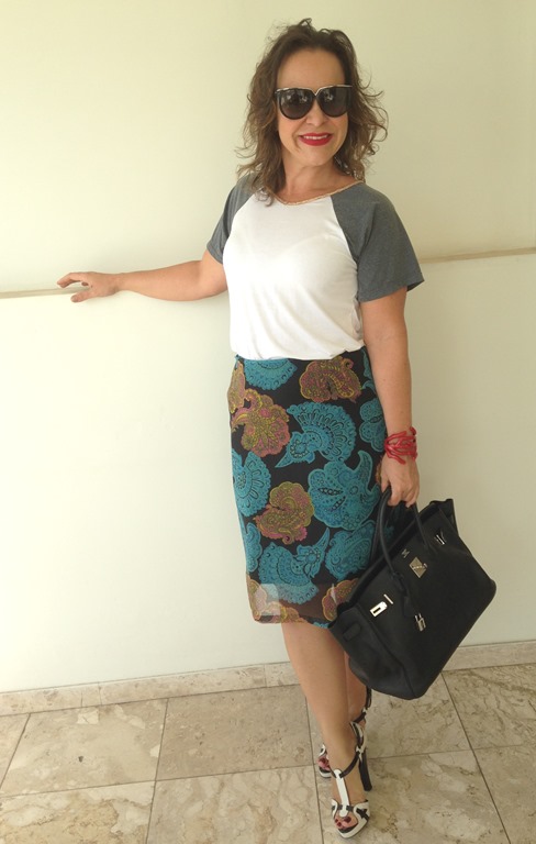 t-shirt + saia vintage – bag HERMÈS – sandália GIORGIO ARMANI – pulseira bijoux comprada em loja de rua no Marais/ Paris – óculos VALENTINO – brinco JOIAS PD
