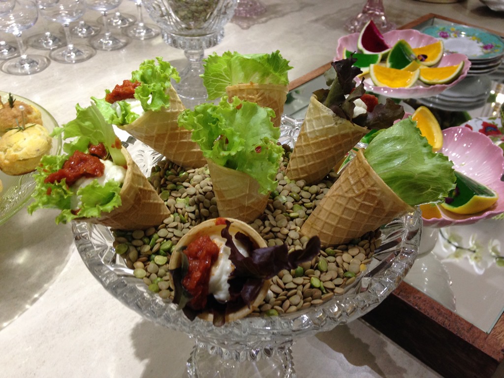 gaspacho frio de aipo e de beterraba servido em taças abertas de champanhe : luxo!