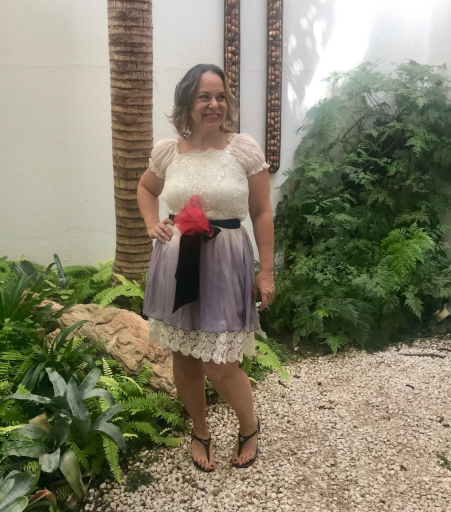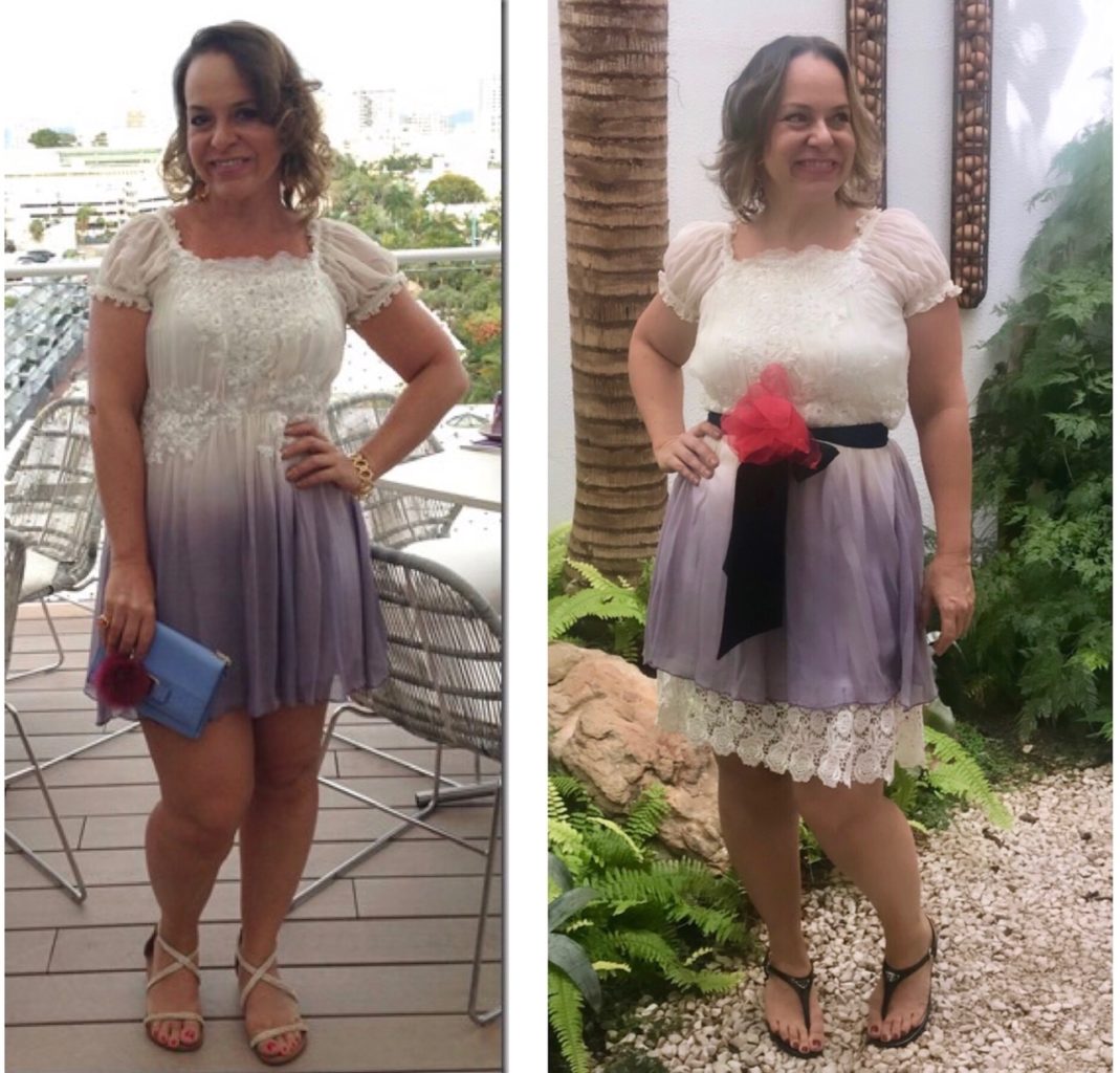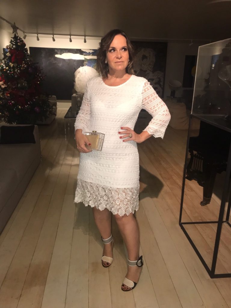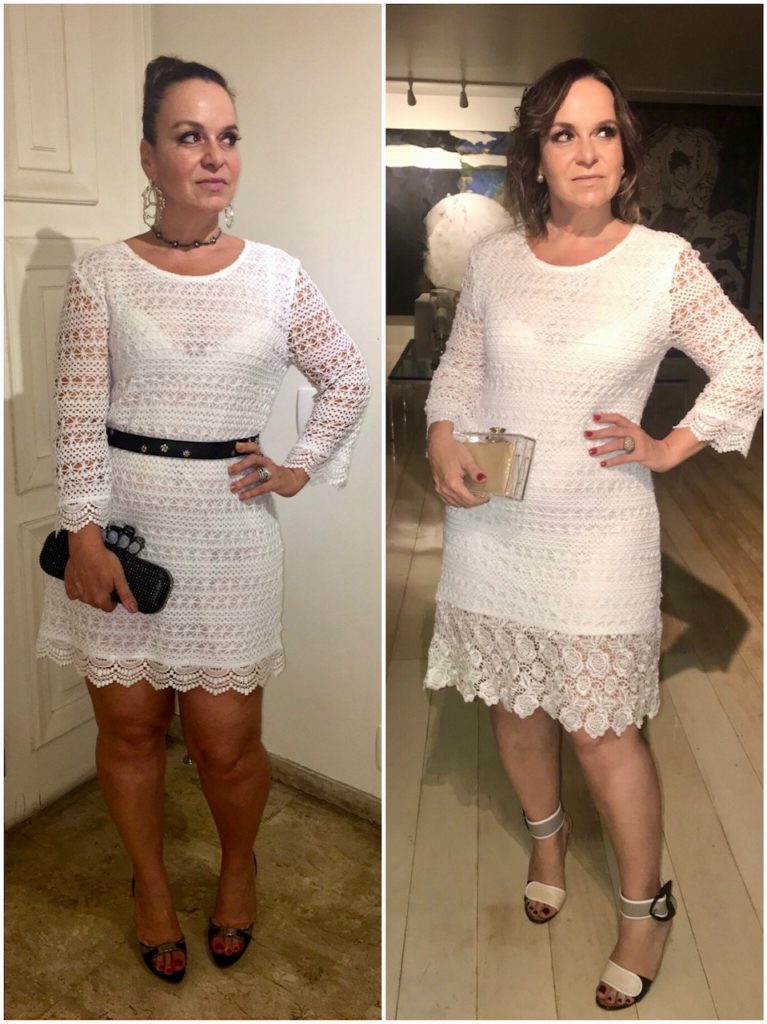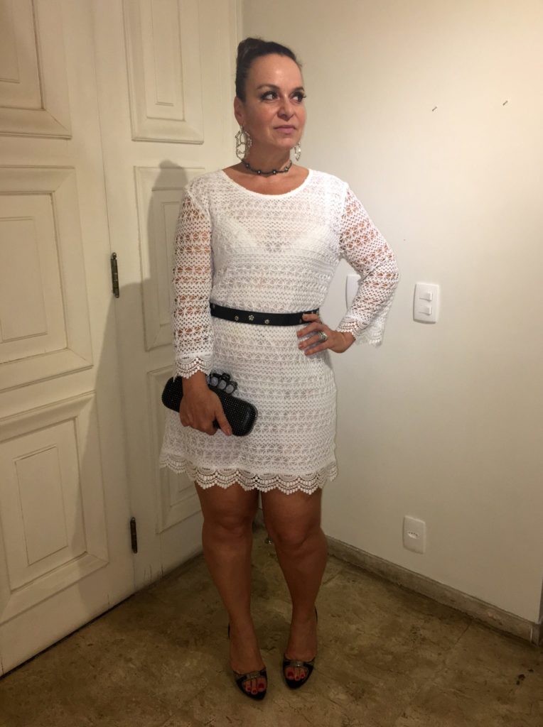 Se você reparar na foto, vai ver que o vestido é o mesmo, mas que mandei adaptar um barrado de renda guipuire que me fez sentir mais adequada e confortável dentro de um mesmo conceito. Para isso é necessário ter uma boa costureira e eu tenho uma que vem em casa para essas mexidas. Aliás, devo confessar que adoro interferir nas minhas roupas. Às vezes, tiro uma manga, em outras coloco um laço, são muitas as posssibilidades de fazer você querer usar aquela roupa de novo.