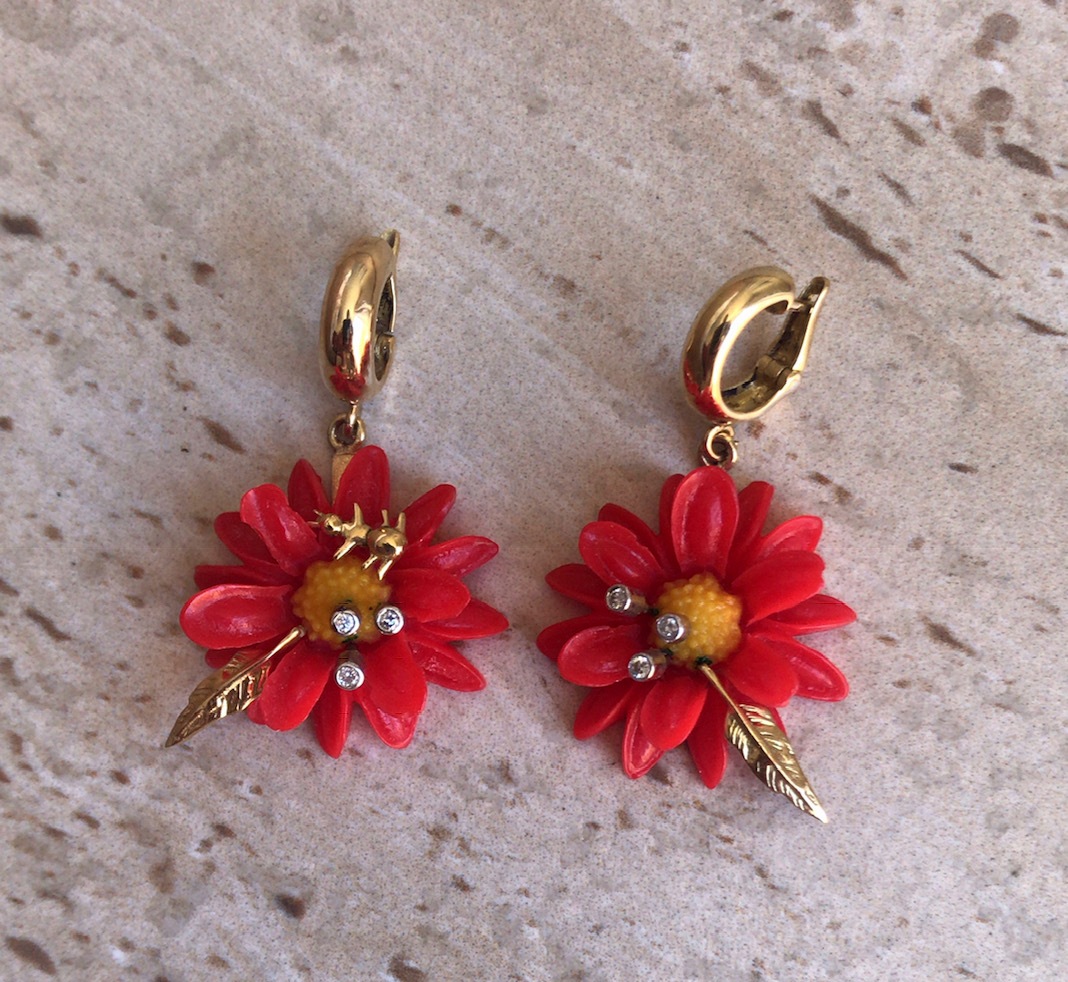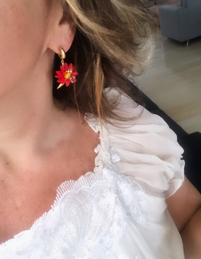 Usei com brinco de flor vermelha a fim de que conversasse com a flor do cinto.