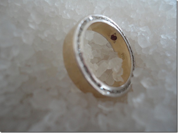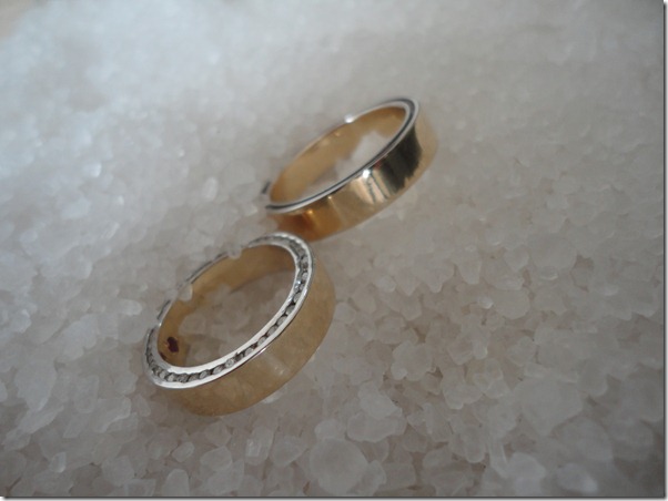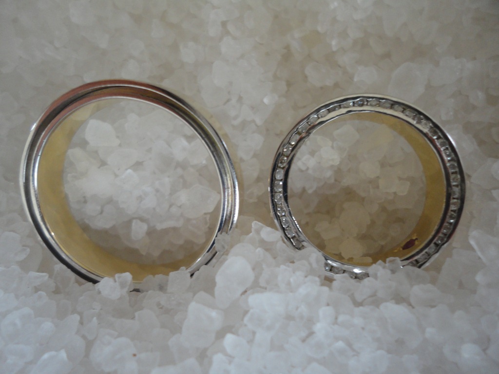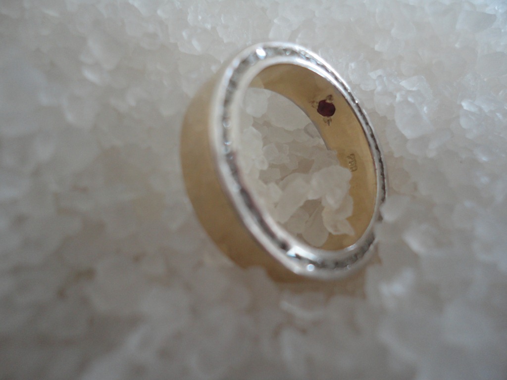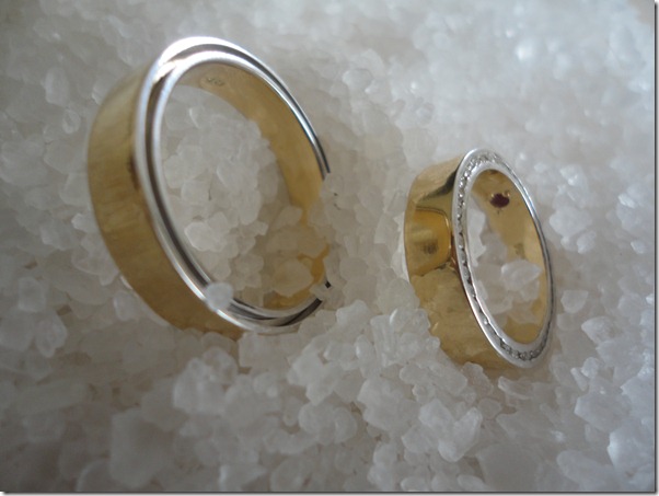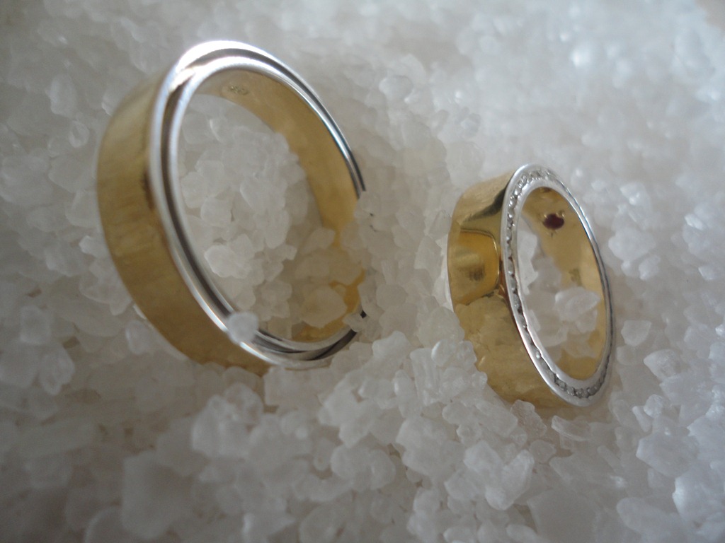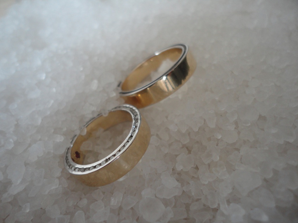 As alianças são em ouro amarelo,com as laterais em ouro branco.A dela ainda tem a lateral cravada de mini-brilhantinhos,e dentro, um rubi vermelho,representando o