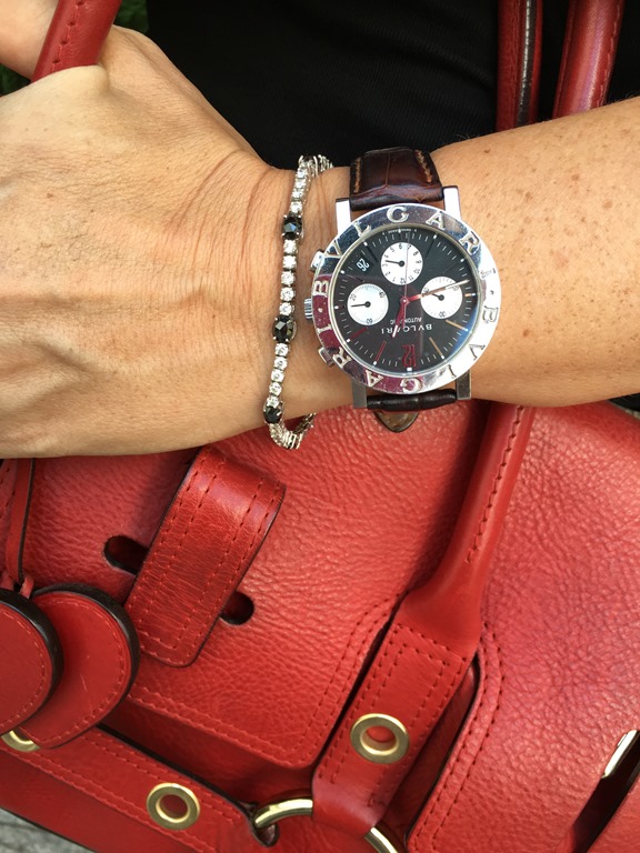 Bege nos complementos : óculos KAREN WALKER – cinto acervo – sandália GUCCI e vermelho no batom e na bag LUELLA