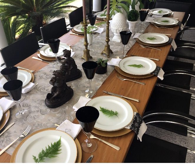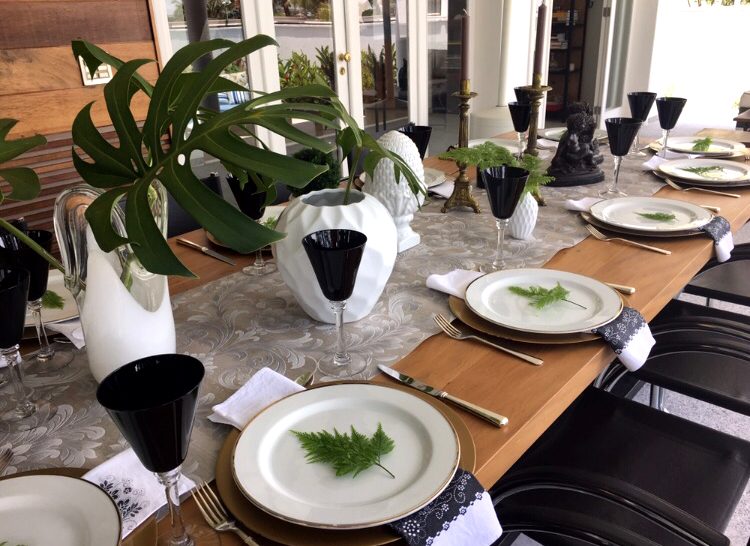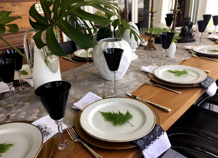 A mesa e a parede de madeira fazem um bonito contraste com o preto, branco, cinza e dourado. Repare: só folhas verdes! Nada de flores; nada de cores! Mantive essa mesma linha! Taças pretas LA VILLE.