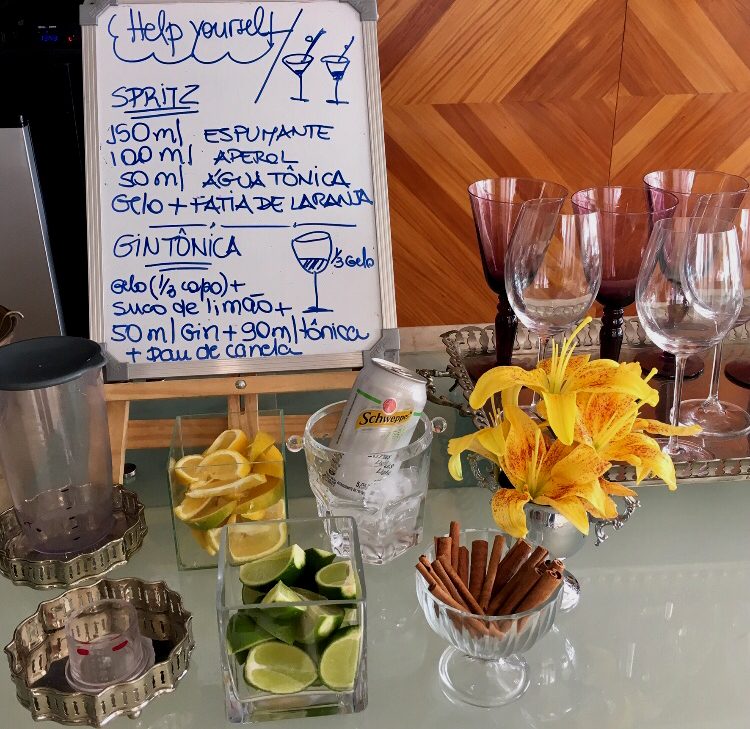 Embora a proposta fosse ficar na varanda, o calorão que fez no dia inviabilizou até certa hora. Tive então, que me reinventar. Montei um bar dentro de casa na base do “Help Yourself” e foi até legal, sabia? Foi “interativo” … rsrsr
