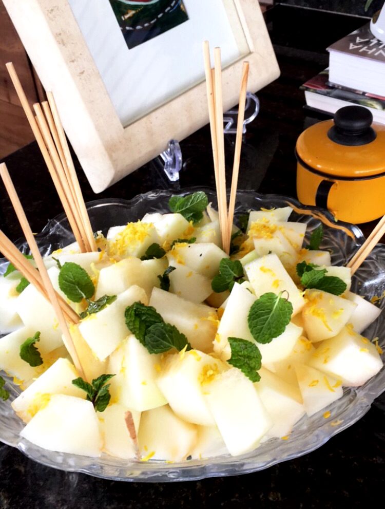 Sempre deixo uma fruta picada: melão com hortelã e raspas de limão siciliano! Detalhe: nunca sobra! rsrs