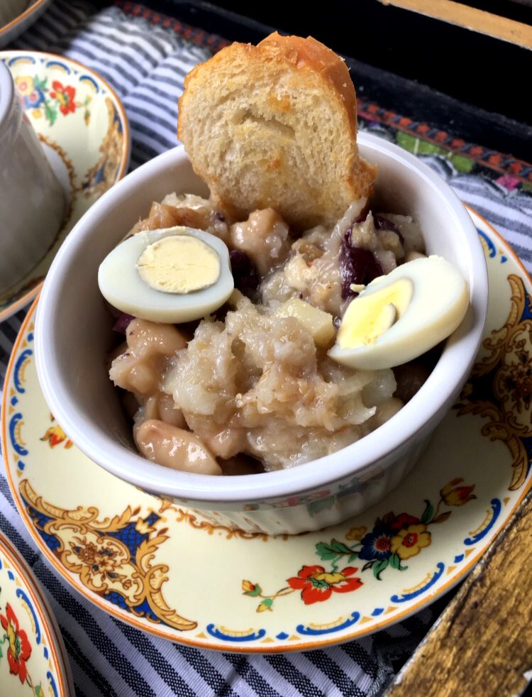 Mini-Bacalhoada: bacalhau desfiado, batata cortadinha, feijão branco, azeitona preta, ovo de codorna e torradinha