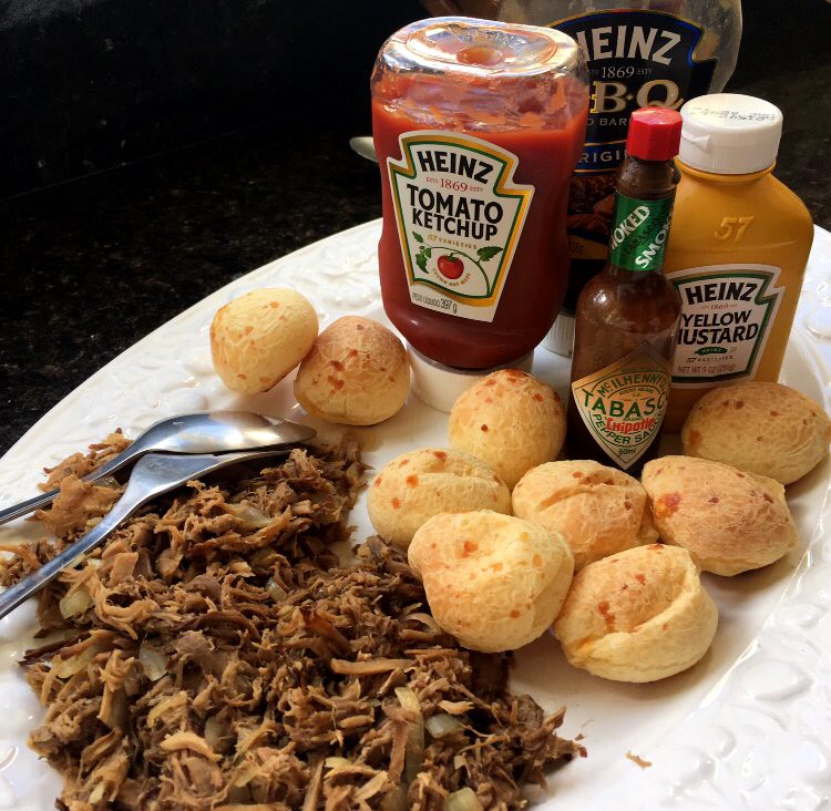 Pão-de-Queijo com pernil desfiado ( Barbecue, Ketchup e Mostarda a parte )
