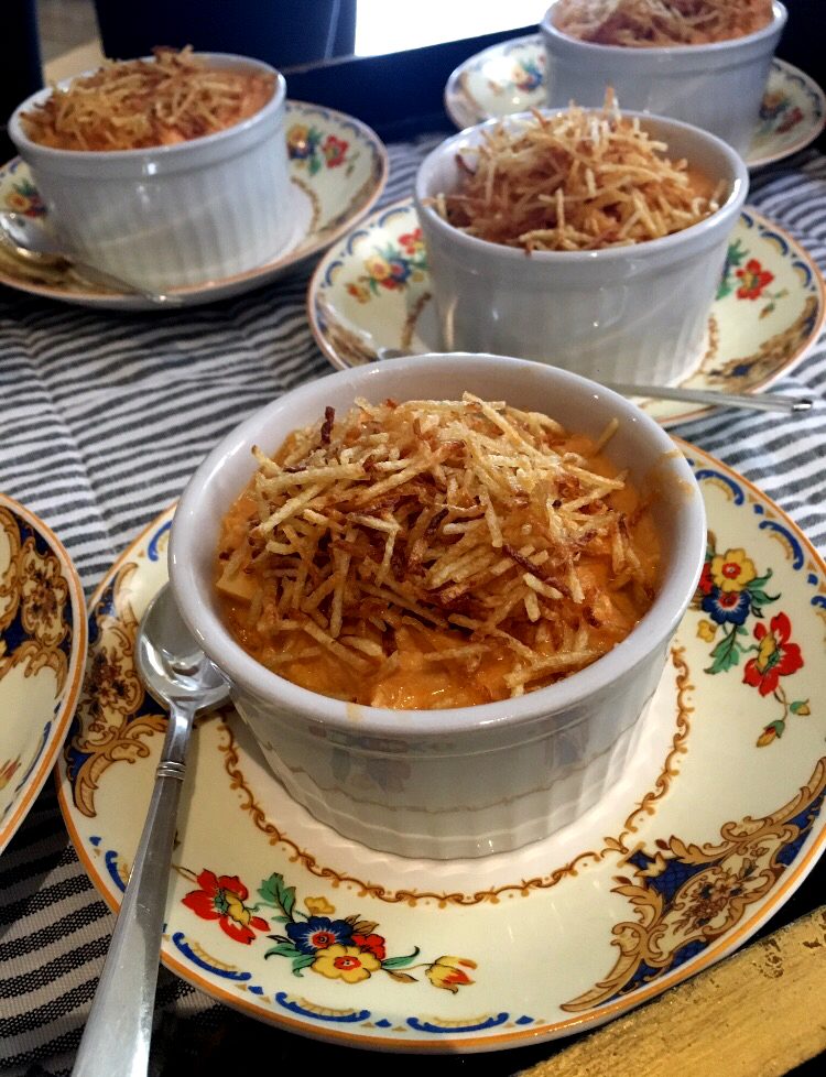 Strogonoff de frango sobre purê de batata trufado – batata palha em cima para dar crocância