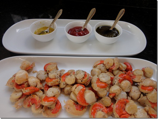 Como eu tinha vieiras, servi-as grelhadas na hora e com 3 molhos prontos mesmo, sem complicação : mostarda trufada , ketchup e pesto. E sabe que ficou ótimo???