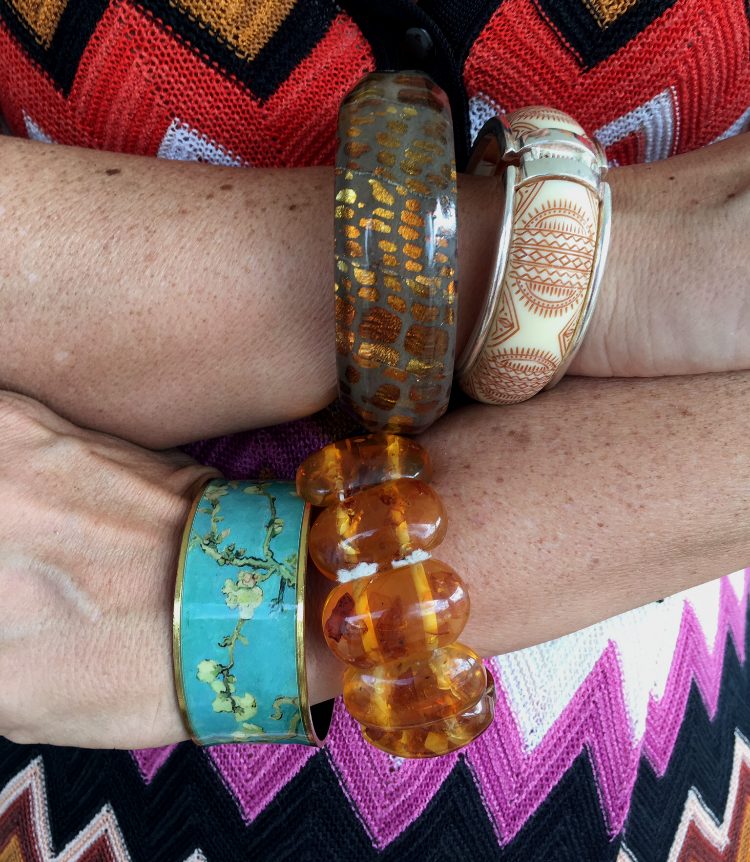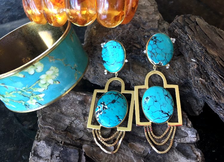 Um brinco de turquesa sempre levanta qualquer look, mas as pulseiras adicionaram cor e “bacaneza” por serem fora do padrão. A azul reproduz uma tela de Van Gogh, e eu trouxe do museu em Amsterdã. A de âmbar é da Rússia e me foi dada há séculos pela minha amiga Lilian ( não sei se ela mesma comprou; acho que foi Tia Sinhá – o que eu sei é que se ela não usa, eu uso e adoro! Rsrs). Curto essas misturas e adoro introduzir elementos não-jóias no meio de jóias. Concordo com Miuccia Prada quando ela diz: “SUA ROUPA É A FORMA COMO VOCÊ SE APRESENTA AO MUNDO, SOBRETUDO HOJE, QUANDO OS CONTATOS HUMANOS SÃO TÃO VELOZES. A MODA É LINGUAGEM INSTANTÂNEA.”