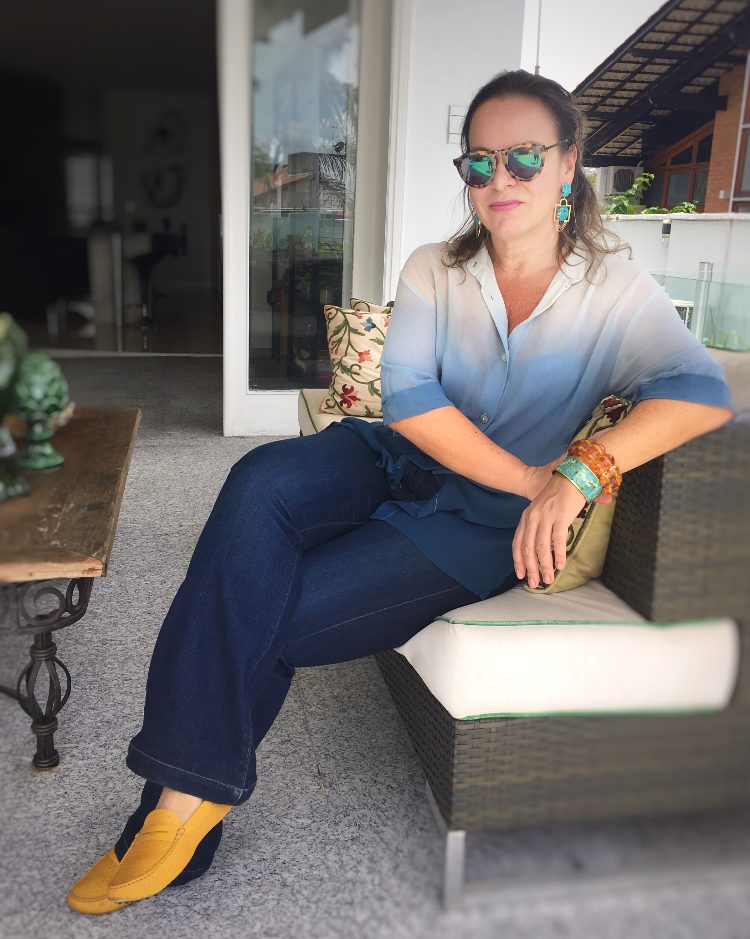 A gente sempre pode imprimir “personalidade” ao look, mesmo numa fórmula básica e clássica. Nesse caso, a camisa era tie-dye, o mocassim era amarelo ( já ajuda, né? ), mas o que sempre conta ponto mesmo são os acessórios que a gente ESCOLHE para completar o seu look.