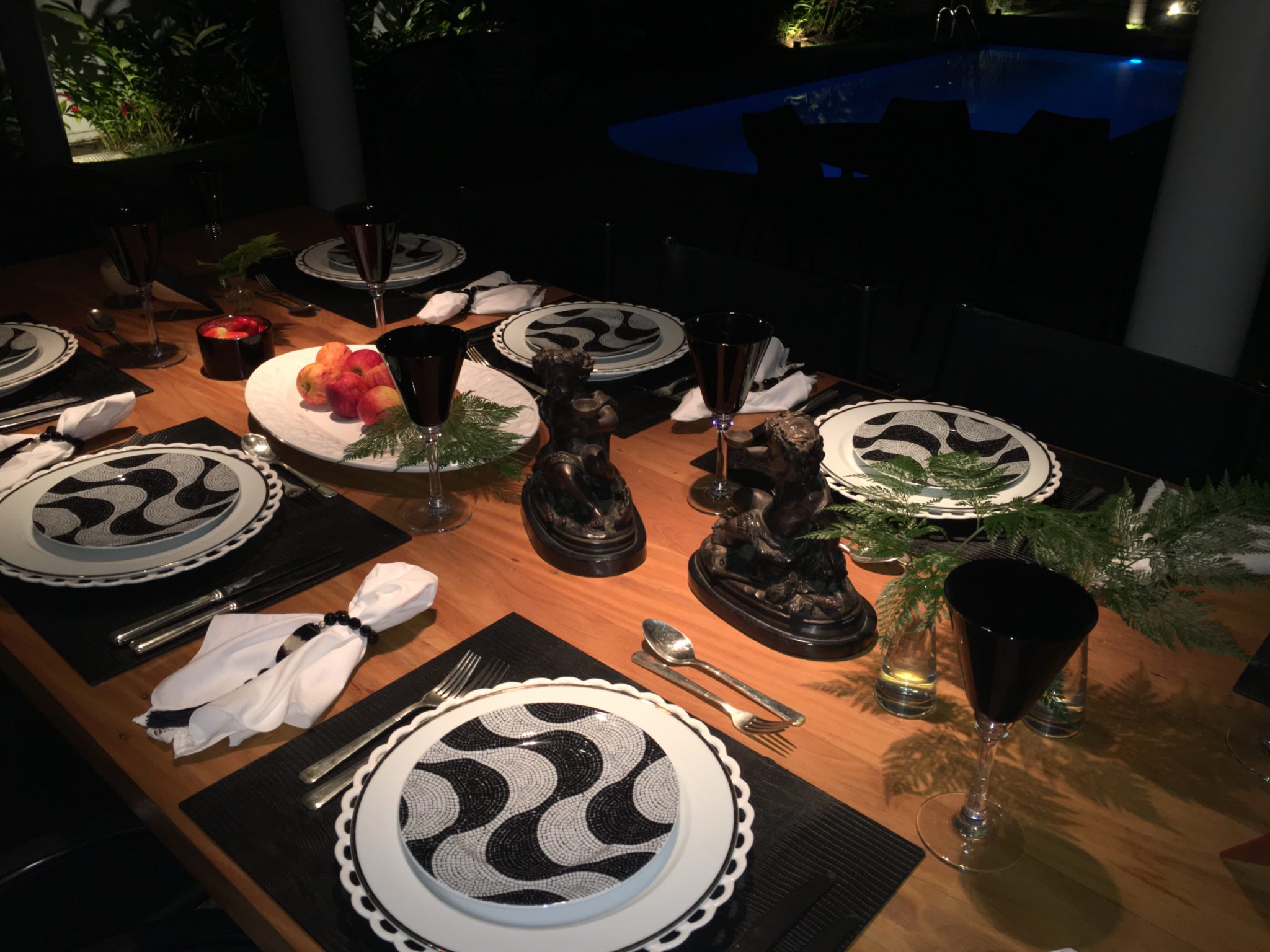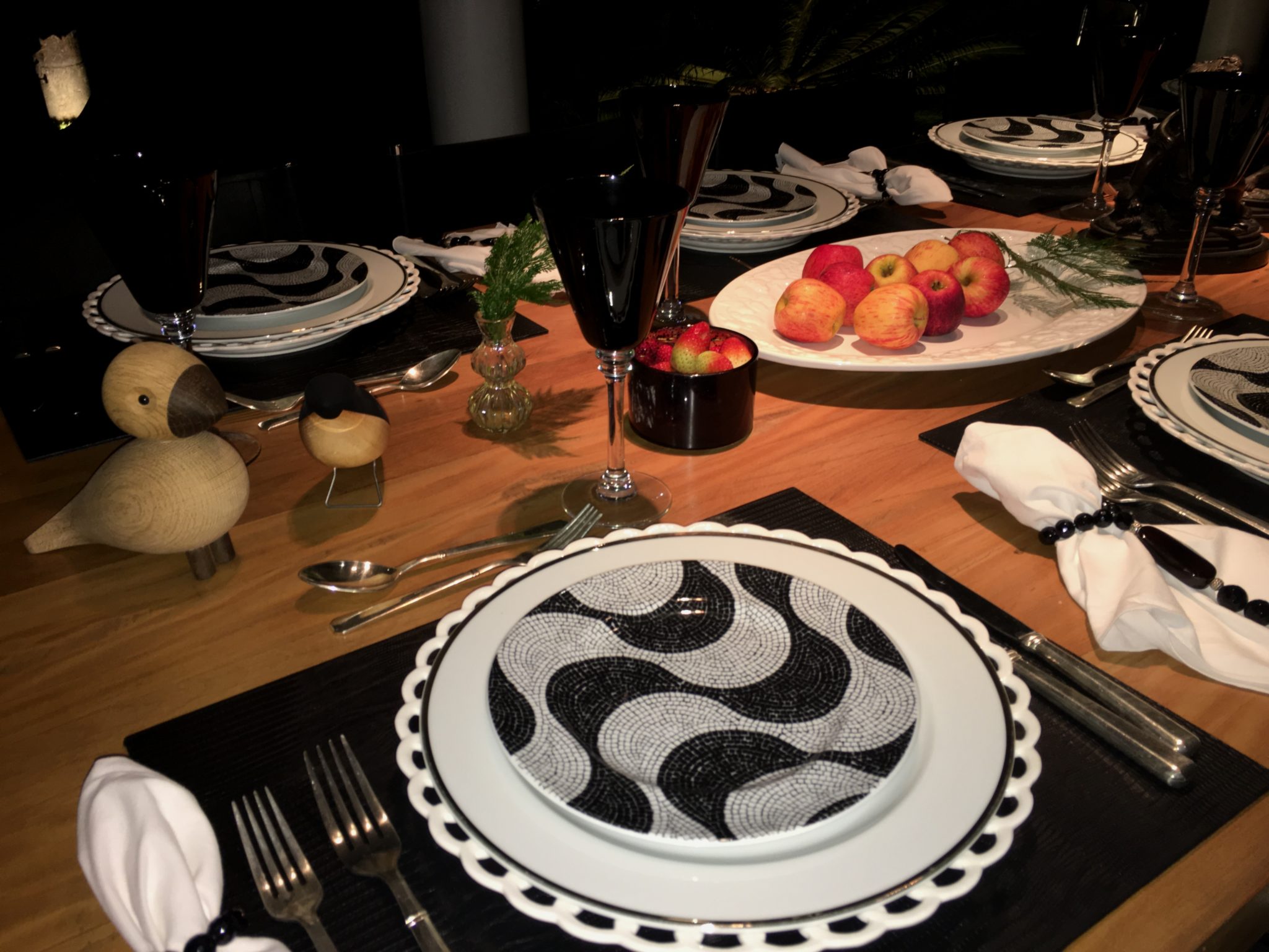 Branco com preto, frutas vermelhas na mesa ( romãs), adornos em preto e um pouco de cor! Dá pra fazer, concorda?