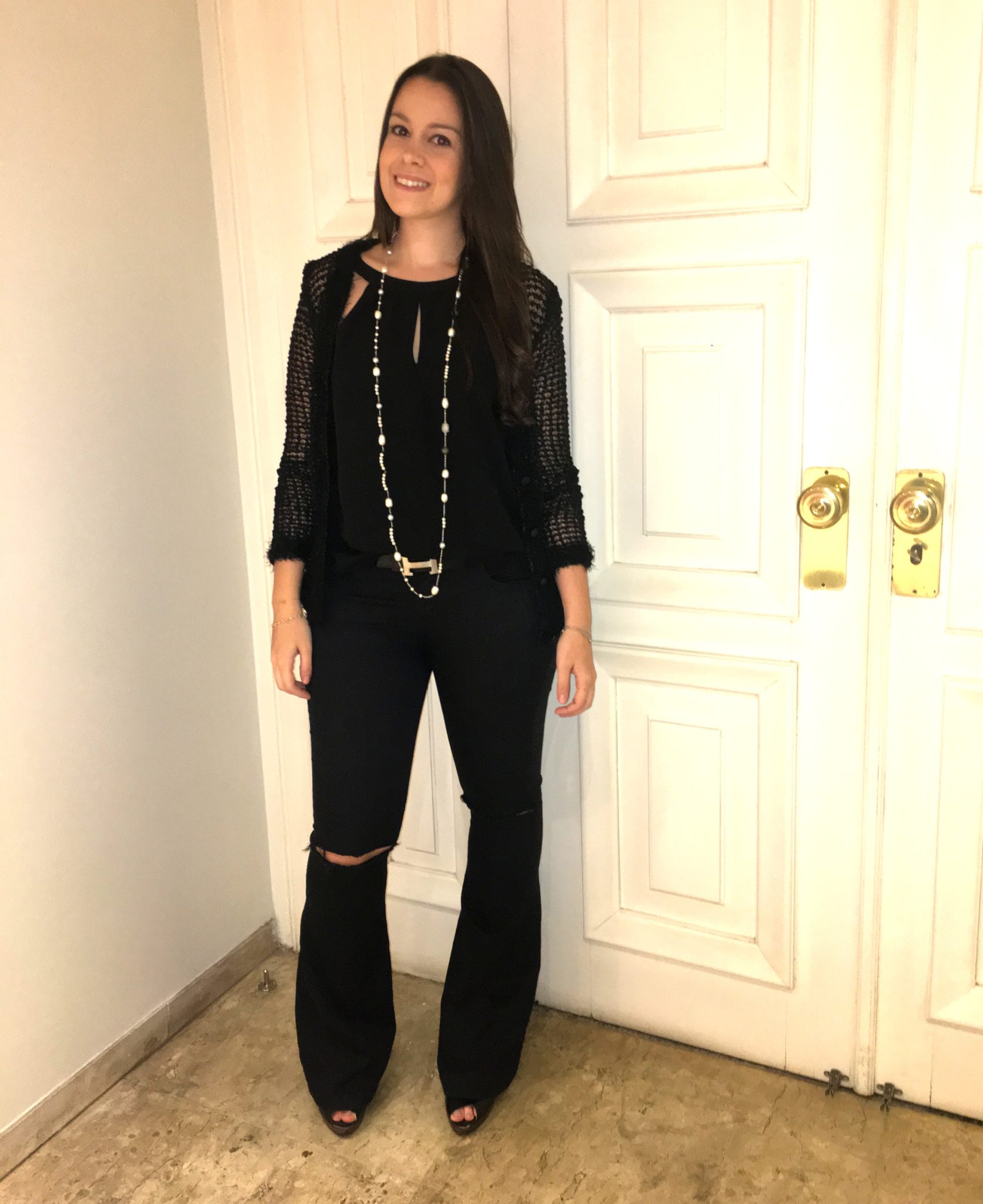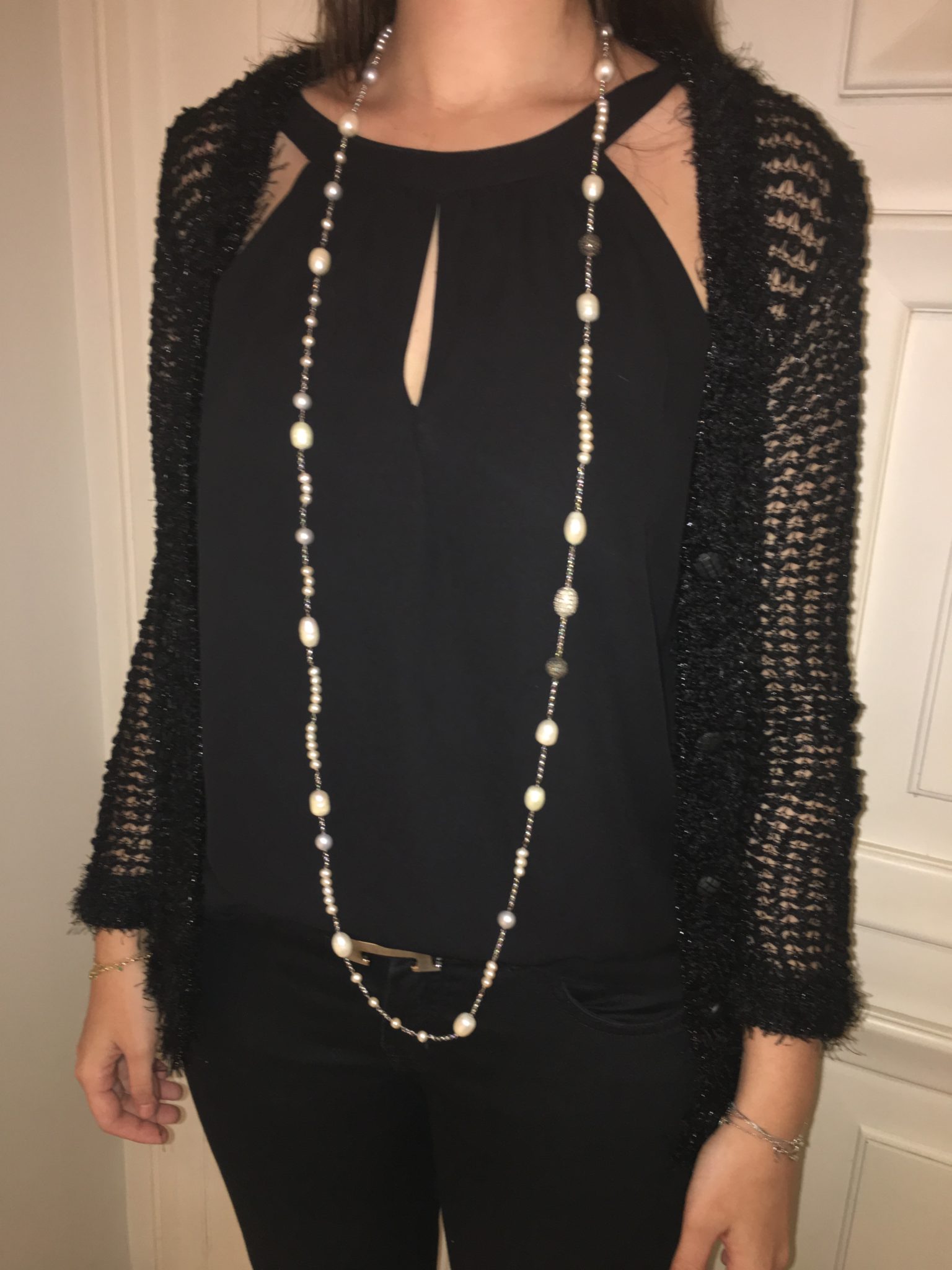 Aliás, ela é sempre bem clássica! Colocou apenas um fio longo de pérolas e brilhantes.