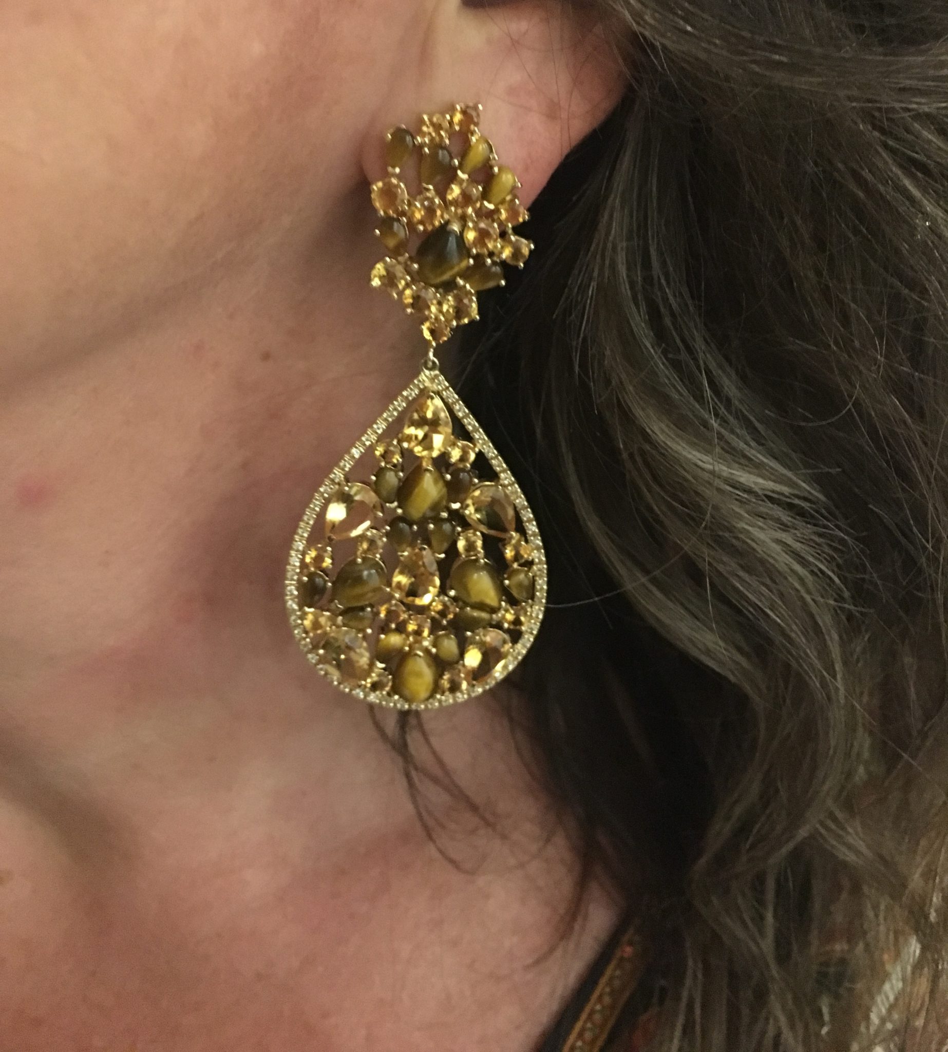 Brinco em ouro, brilhantes, olho de tigre e citrine | Para ser seu 31 99955-5410