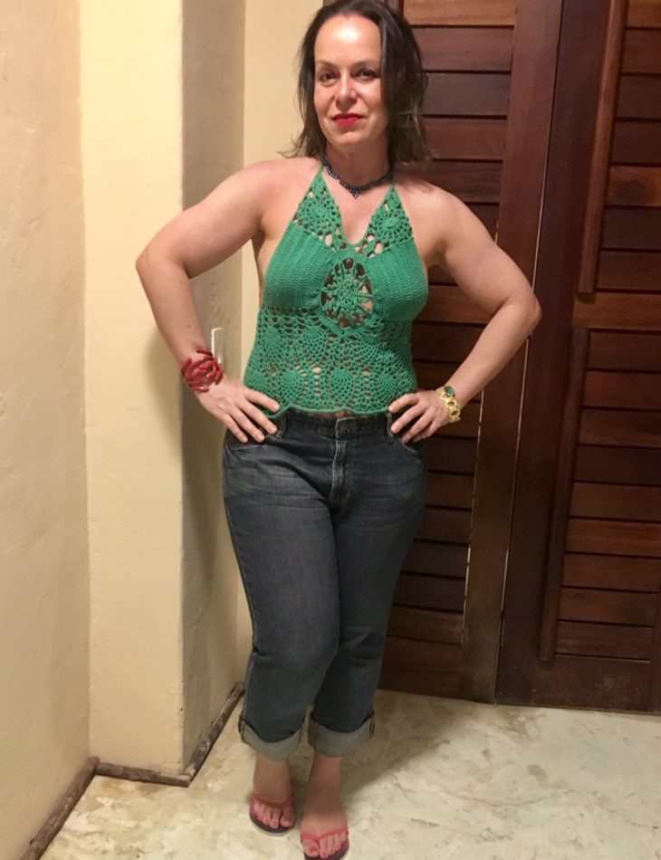 Pense em espaços generosos, jardins lindos e floridos, decoração impecável! Dá vontade de ficar colorida assim como é o lugar. O mesmo top de croché eu repeti dias depois com jeans, multiplicando os looks da mala. Take a look!