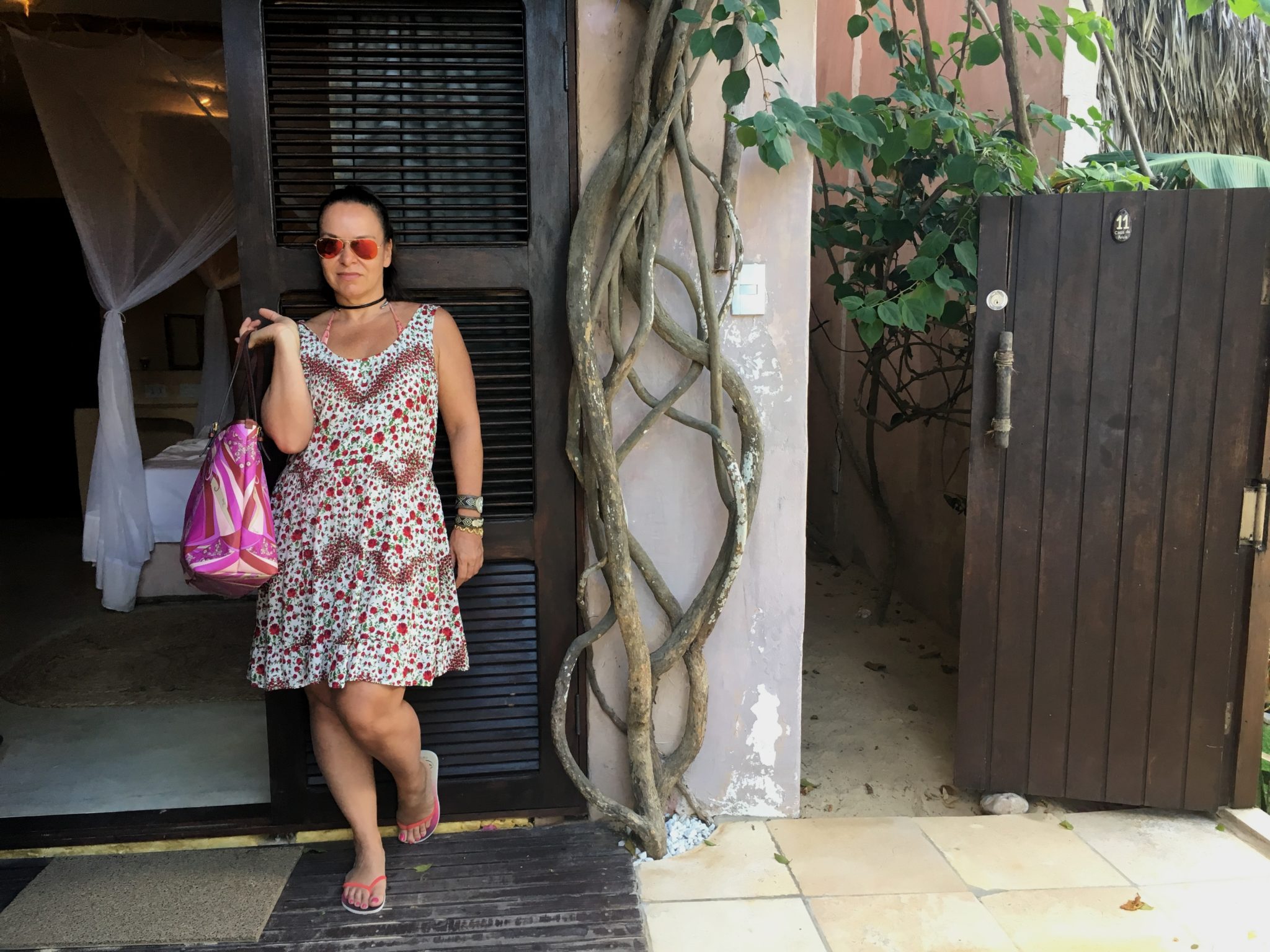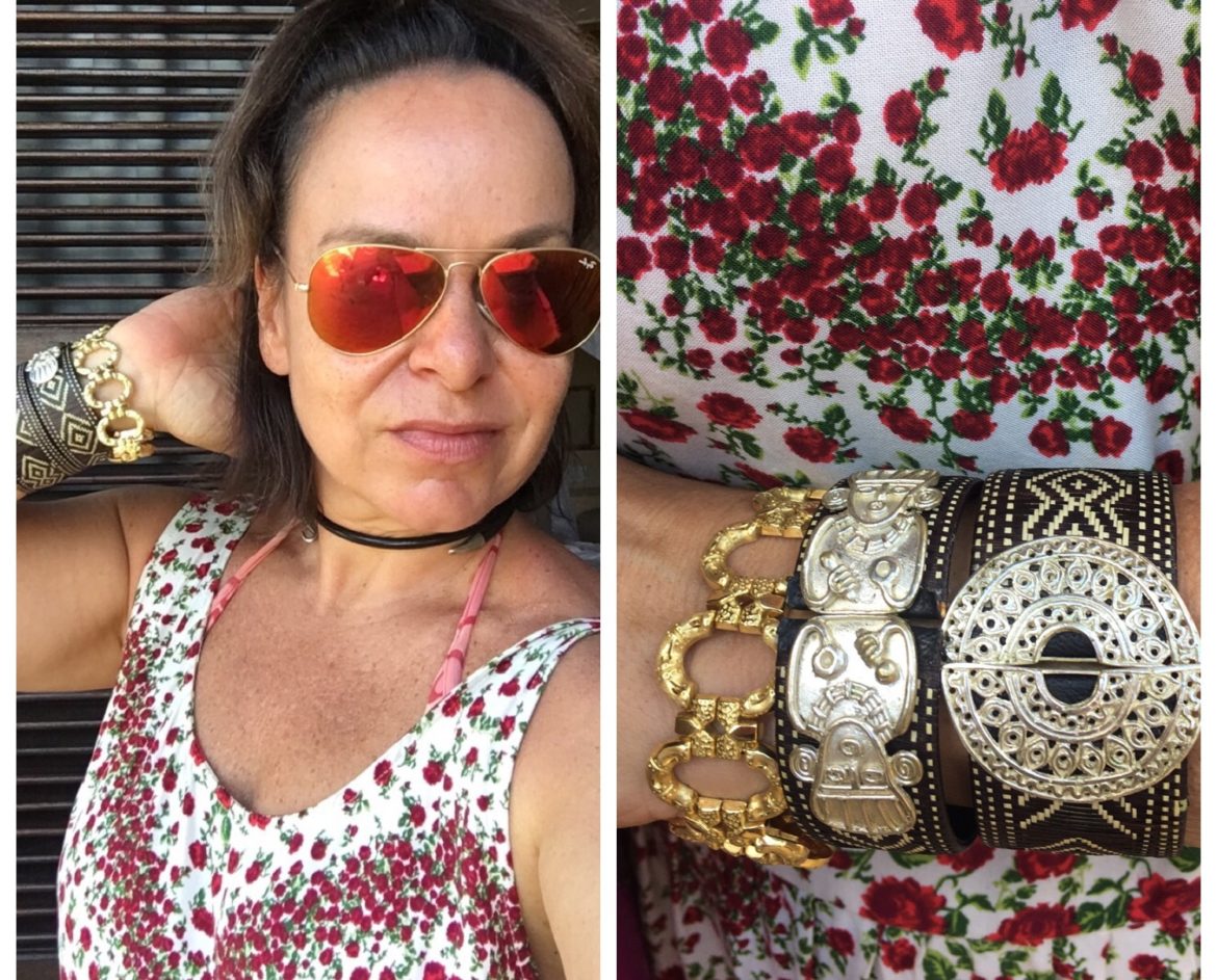 Lembra da mala otimizada? Usei dias depois o mesmo biquini e o mesmo vestidinho floral com uma outra cara! Mudando-se os acessórios, muda tudo, concorda? Misturei pulseira de ouro com pluseiras de prata e palha e uma argola de ouro com choker de couro!