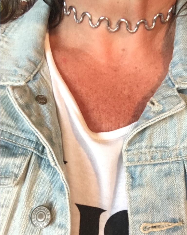 Nessa parte de fora, ficava a área de food trucks e o galpão de design. Mesmo não sendo mais uma feira enorme, vale sempre a pena estar de sapato baixo. Look super casual e de joia, apenas uma choker de ouro branco que tem regulagem para ser usada como colar também.