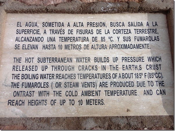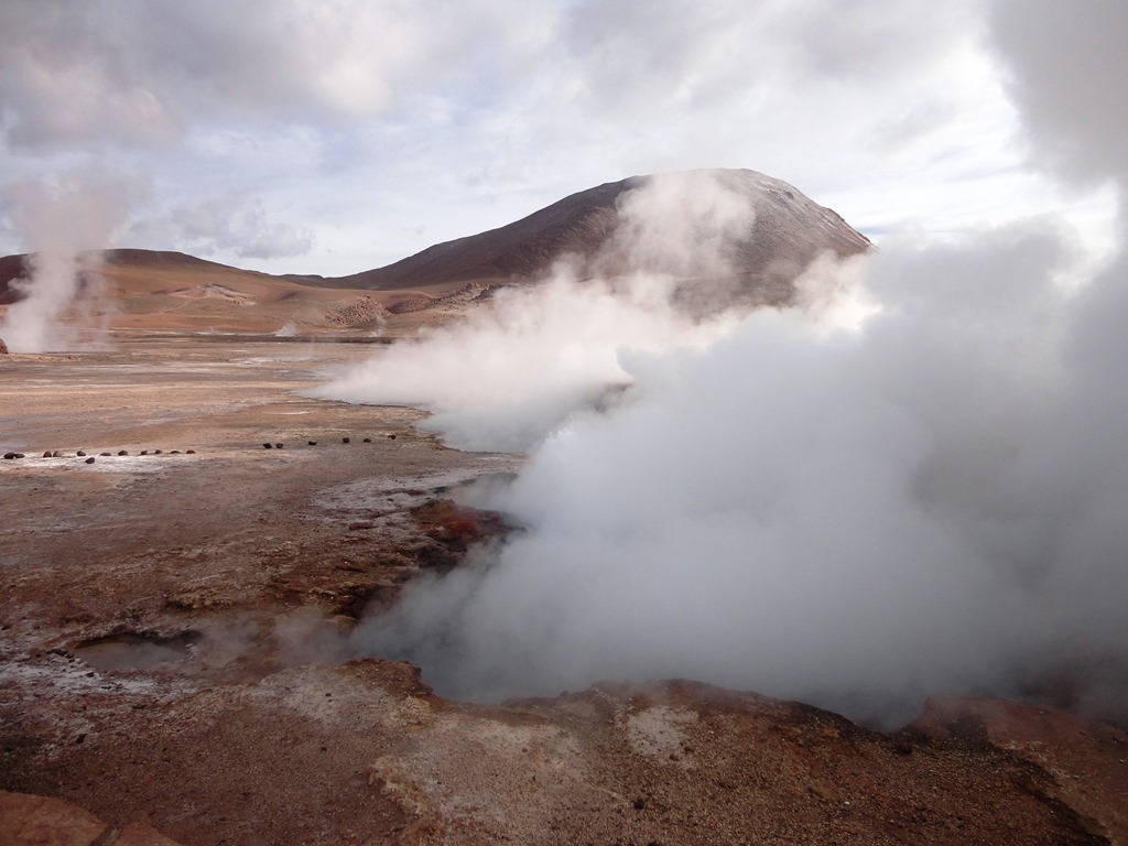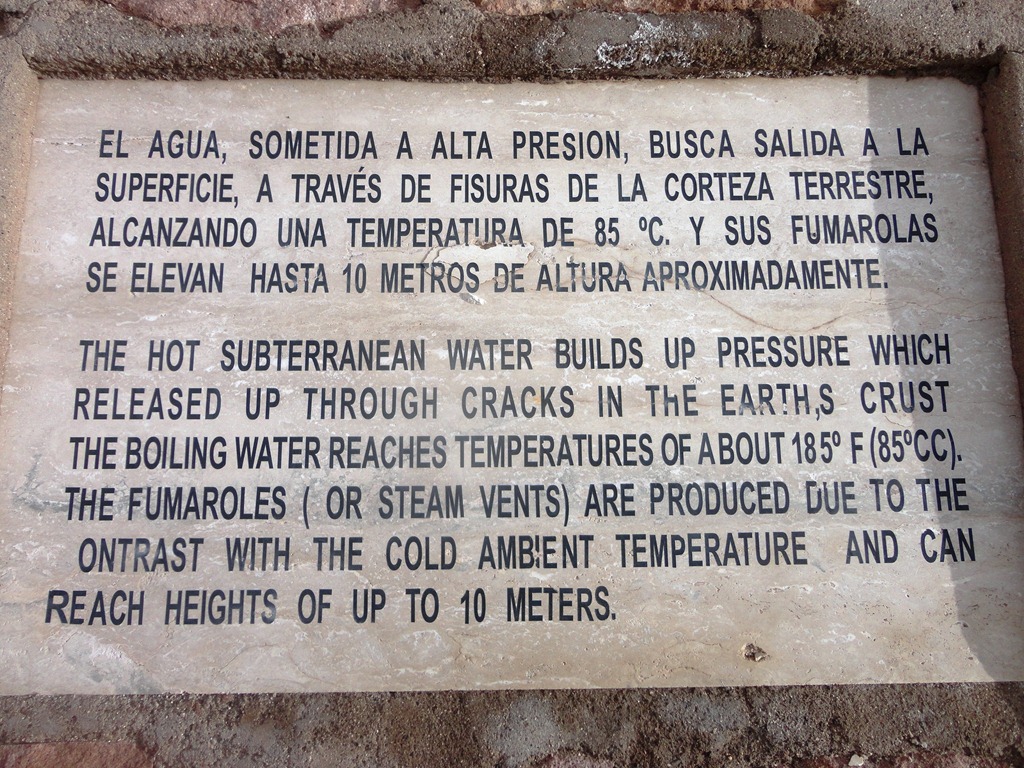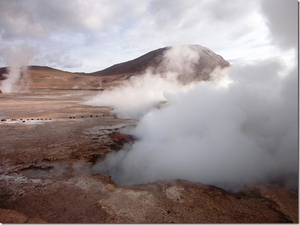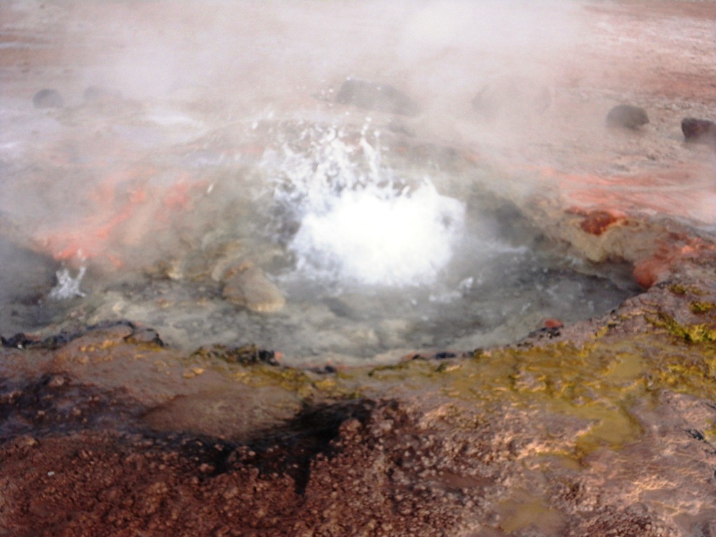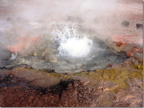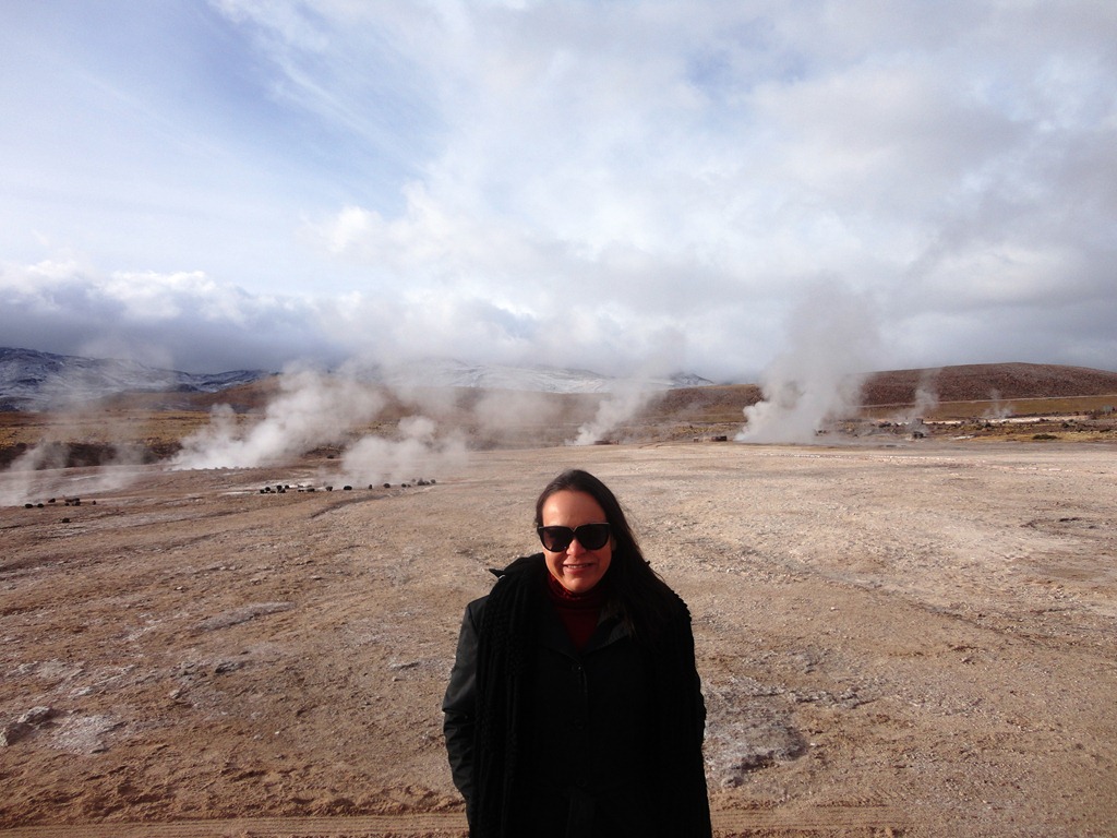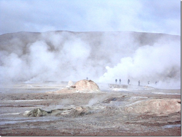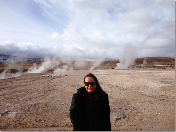 O passeio mais espetacular é o GEISERS DEL TATIO. Saímos às 5:30 da manhã do hotel, em direção ao Parque Nacional onde estão os geisers, que são jatos de água fervente que saem do solo de origem vulcânica. Por que tão cedo? é o melhor visual, pois no contraste do frio externo ( chegando até a –27 o em julho de 2011) com o calor da água, eles explodem violentamente, e ao nascer do sol,a vizualização é melhor. Demos muita sorte! No dia em que fomos ,a temperatura estava ótima! –5 graus !!! rsrs Na noite anterior,recomenda-se não beber alcoólicos,nem comer carnes e comidas mais pesadas. No dia seguinte, sair em jejum, e no caminho mascar folhas de coca. Tudo isso para suportar melhor o trajeto sem enjôos a uma altitude de 4600 m acima do mar.