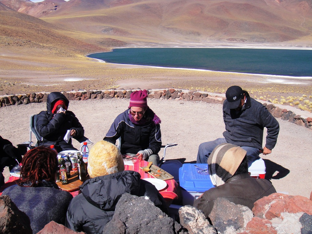 piquenique à beira da laguna e abaixo,uma família de vicunhas.