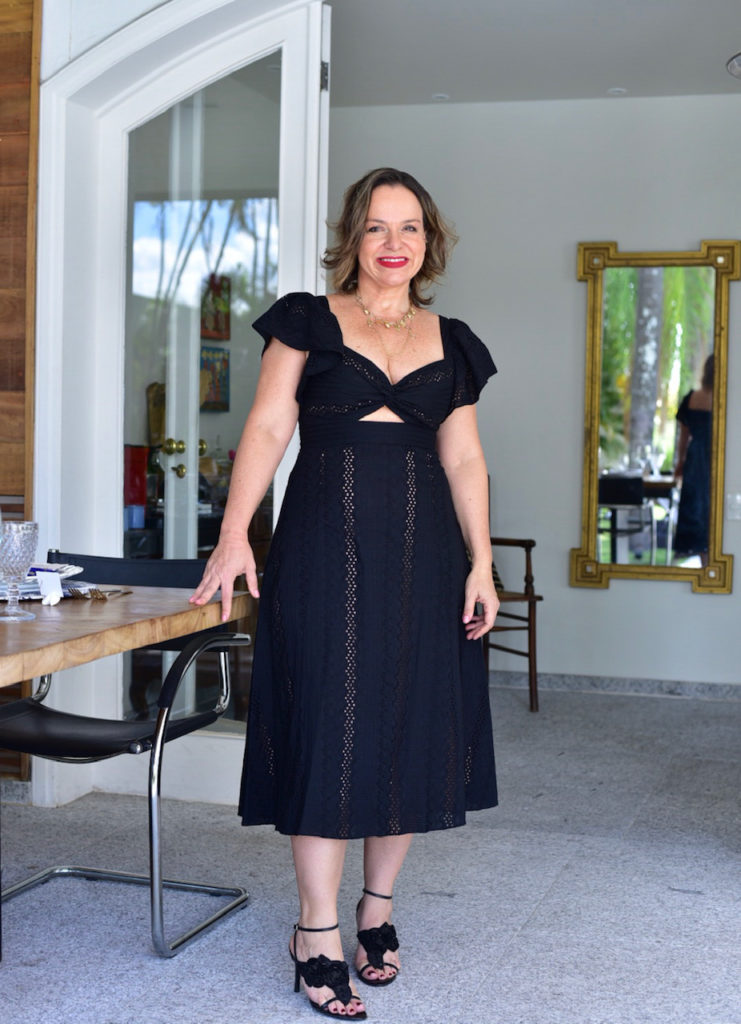 Por ser uma joia bem “incrementada”, sugiro usar com base neutra, para que ela brilhe sozinha. Eu escolhi usar vestido e sandália preta para receber em almoço de sábado e um brinco bem pequeno para que não ficasse “too much”.