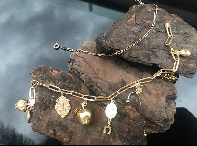 Na verdade, essa joia de berloques pode ser usada como colar, se for ligada ao extensor de ouro como na foto acima, ou também como tornozeleira ou pulseira avulsa como na foto abaixo.
