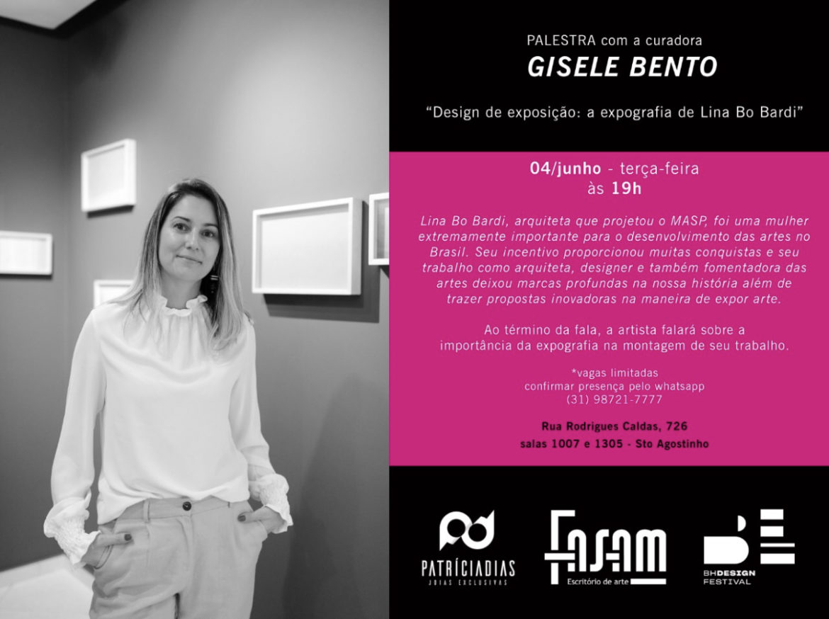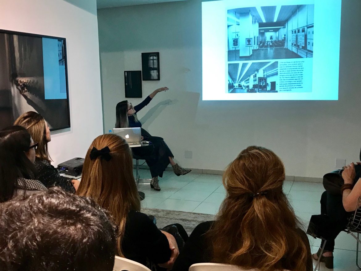 No 1o. evento de 3a feira, Gisele explicou como a multifacetada arquiteta e designer LINA BO BARDI pensava os espaços de exposição nos museus onde trabalhou. Visionária que era, ela gostava de dar ao público a oportunidade de transitar bem perto das obras. Os cavaletes permitem a observação por todos os lados, inclusive. É dela o desenho dos atuais cavaletes do MASP, um modo único no mundo de mostrar o acervo.