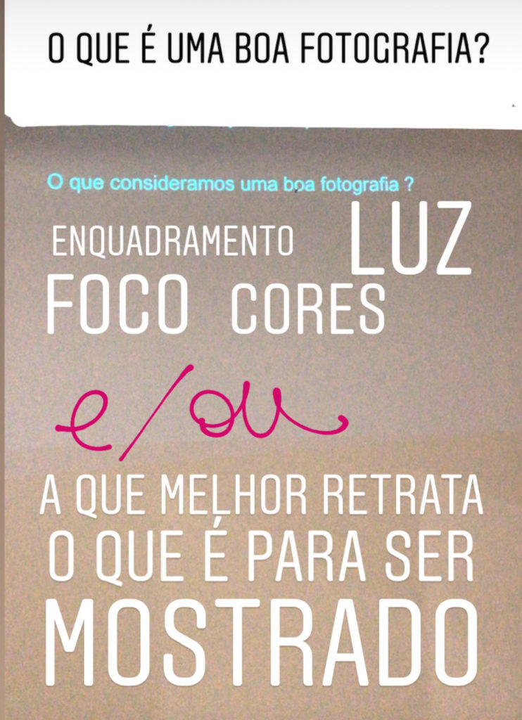 O que vem primeiro: a técnica ou a intenção da foto? Através dessa reflexão, Isis nos ensinou a treinar o olhar e a buscar novas possibilidades. Analisou a evolução do enquadramento na história, discutiu a importância da fotografia hoje. Casa cheia de novo. Aliás, hoje é o último dia.