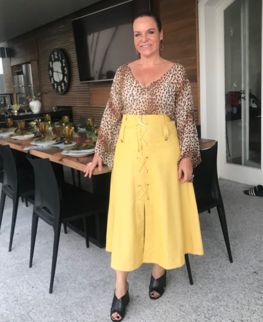 O amarelo está em alta – veja AQUI !  Essa saia da TAHARI foi a estrela do look com animal print e complementos pretos – sapato e joias.