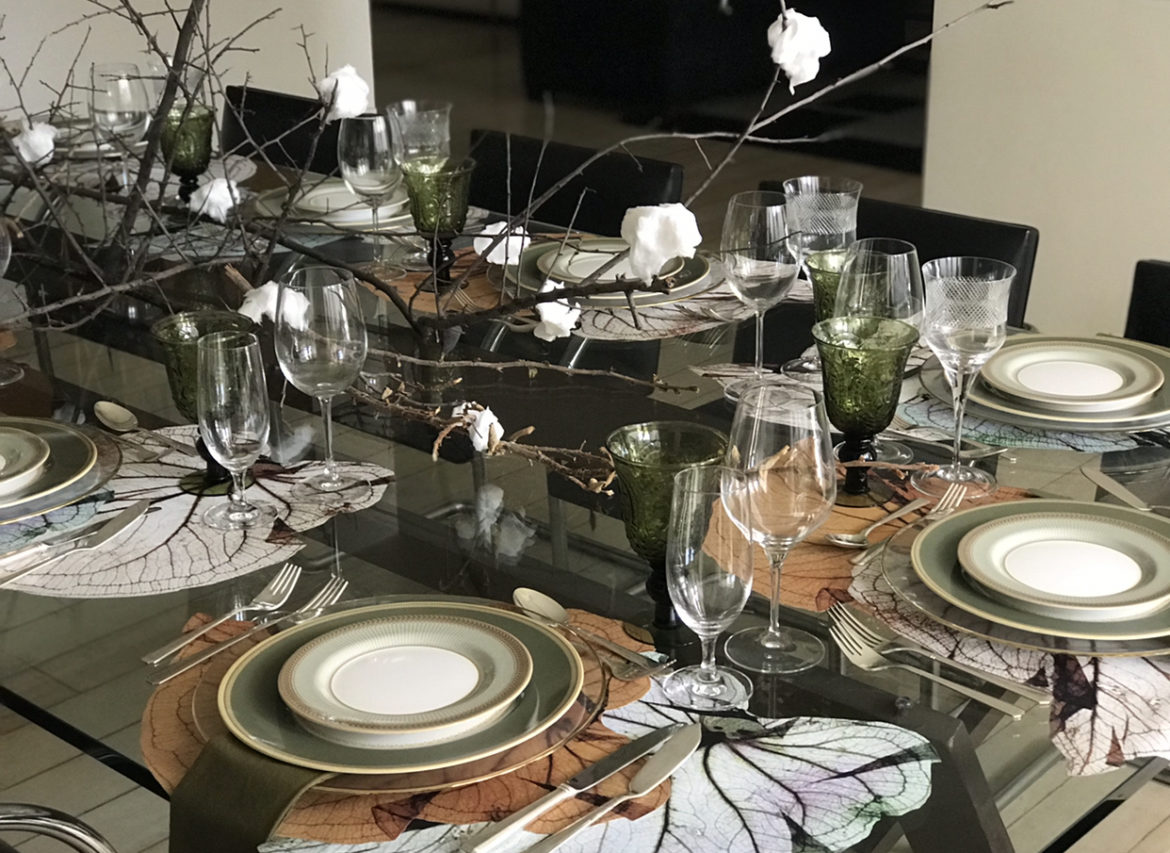 Comecei dispondo os jogos de folhas – 2 em cada lugar – de cores diferentes . Repare que variei também a forma de colocá-los na mesa. Cada lugar tinha tons e posicionamento diferentes entre um e outro. Na hora de escolher a louça, recorri ao lindo acervo da SOUSPLAT e me encantei por esse verde folha, minha opção também no guardanapo.