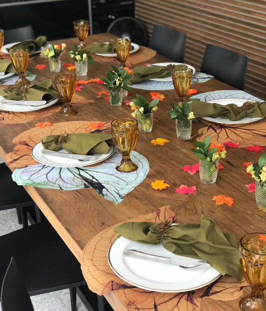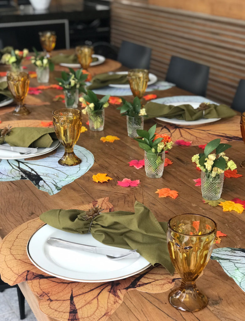 Repare que repeti o mesmo guardanapo verde musgo da outra mesa, porém dessa vez com porta-guardanapos verdes de flor. Usando as mesmas folhas da MAPERLE , você vê que consegui duas montagens absolutamente diferentes entre si, ainda que  mantendo o mesmo conceito “Outono em NY”.