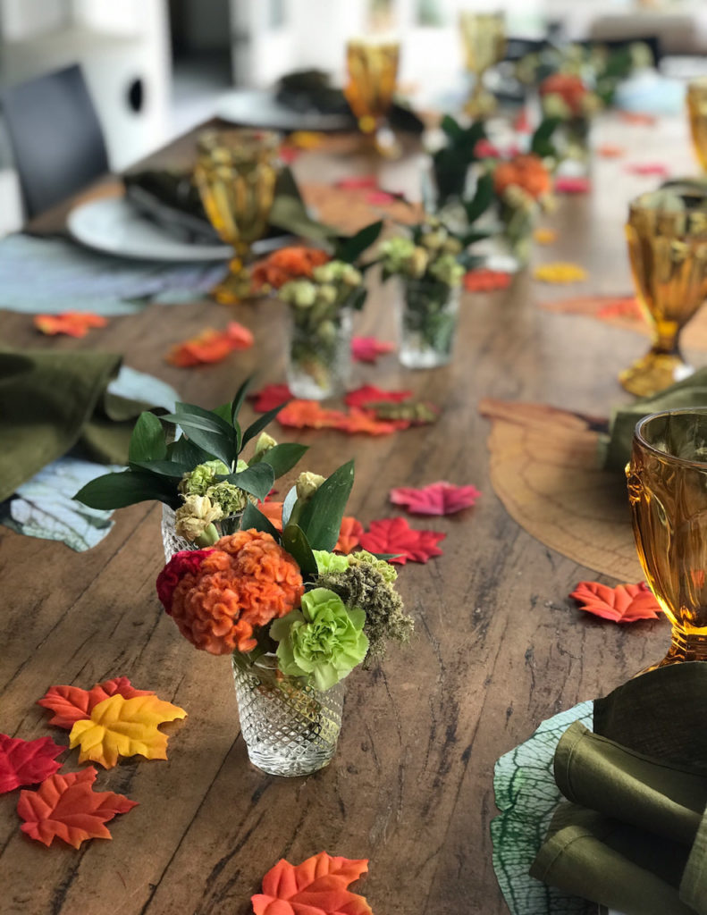 Não só eu montei o arranjo de galhos, como também usei as flores nos mini-vasinhos de vidro nessa outra composição. As “folhas secas de outono” vieram exatamente de NY, presente de uma amiga no ano passado.