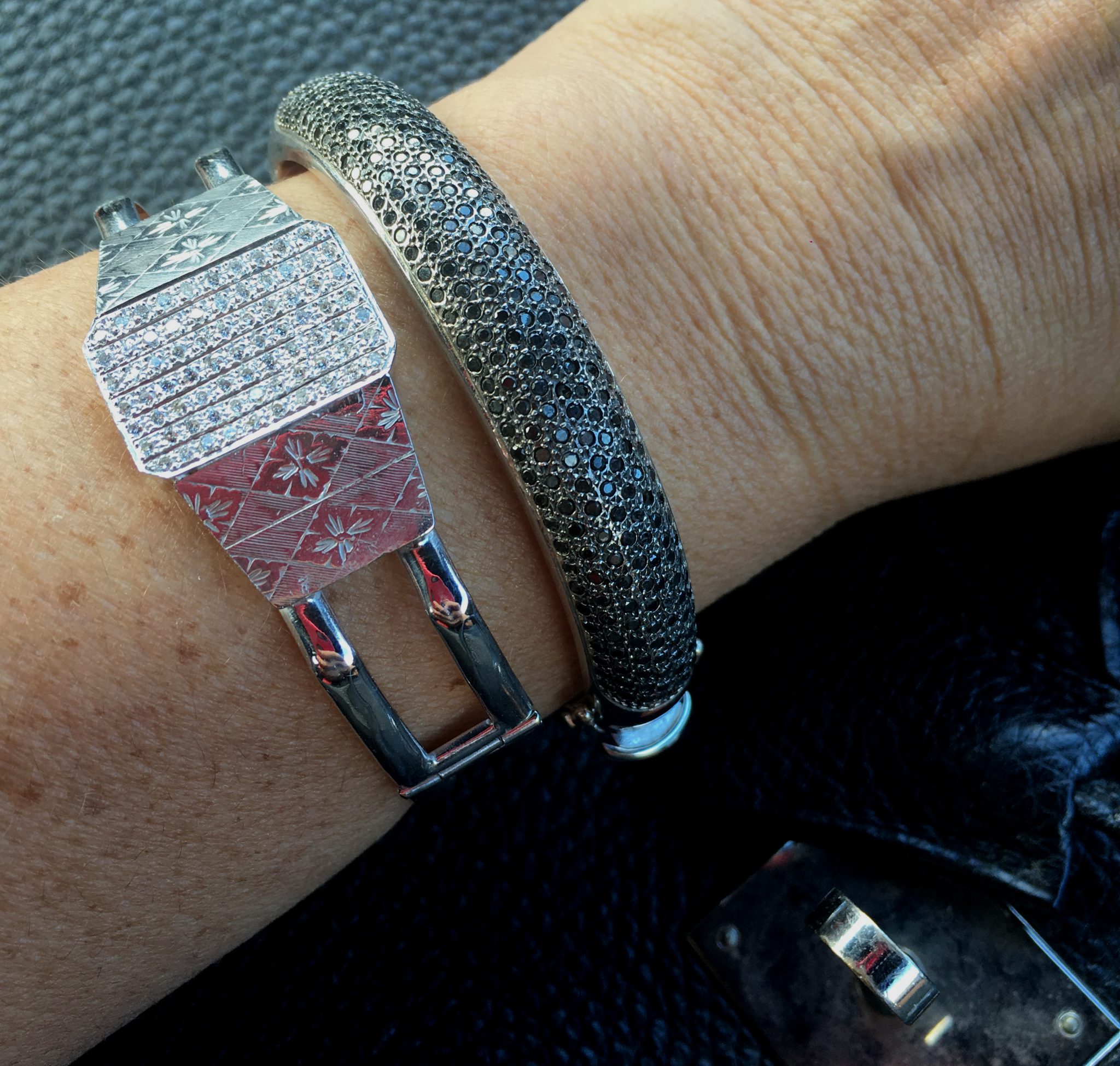 Colar em pérolas e brilhantes , anéis e braceletes em brilhantes e brilhantes negros